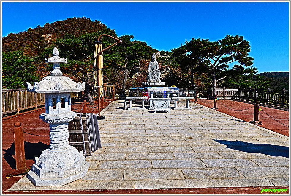 이제 고려산 주능선을 이탈해 좌측 적석사로 가는데. 내려서는 길이 매우 까다롭습니다. 나무데크로 만들어진 길을 가면 낙조대 보타전입니다. 보타전은 관세음보살님이 계시는 곳을 의미한다는데 이곳은 전국 3대 낙조명소 겸 강화8경의 하나로 낙조의 풍경이 매우 화려한 곳입니다. 여기서 바라본 고려저수지(내가저수지)의 풍경이 그림 같고 혈구산도 상당히 큰산처럼 보입니다.