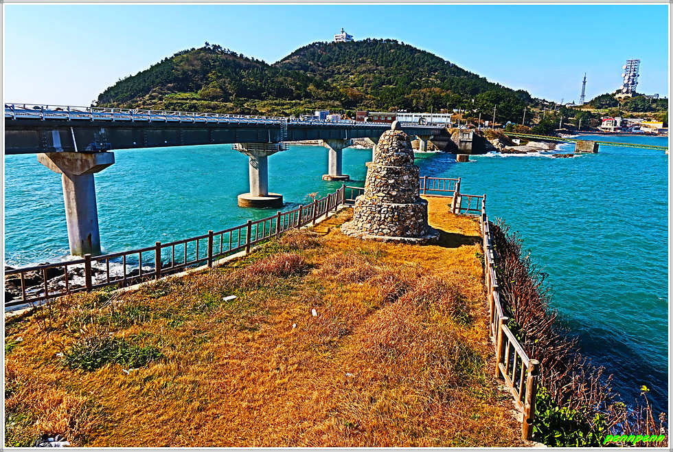 돈대산 정상을 뒤로하고 추자대교 방면으로 하산합니다. 능선에서는 목적지인 상추자도항 포구가 멀리 보입니다. 산불감시초소에 서니 상추자도의 모습이 더욱 잘 조망되네요. 숲길을 걸다가 상수도시설물을 통과하면 상하추자도를 이어주는 추자대교입니다. 추자대교 남단에는 이곳의 특산물인 대형 참굴비 조형물이 있고 돌탑도 보입니다.
