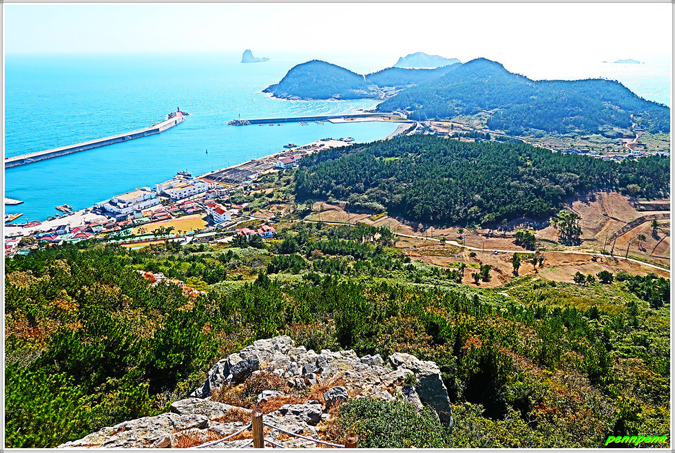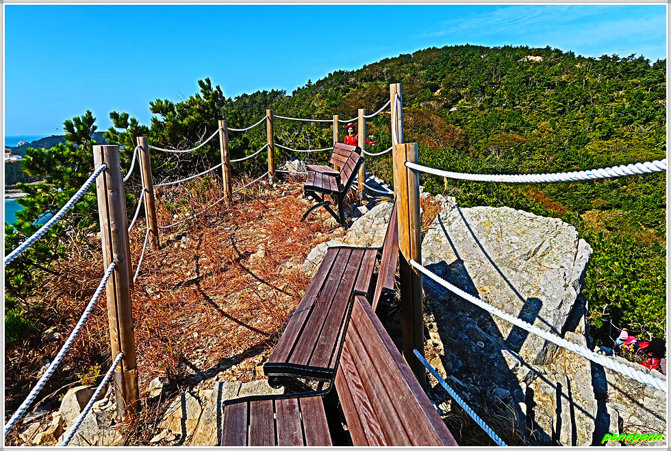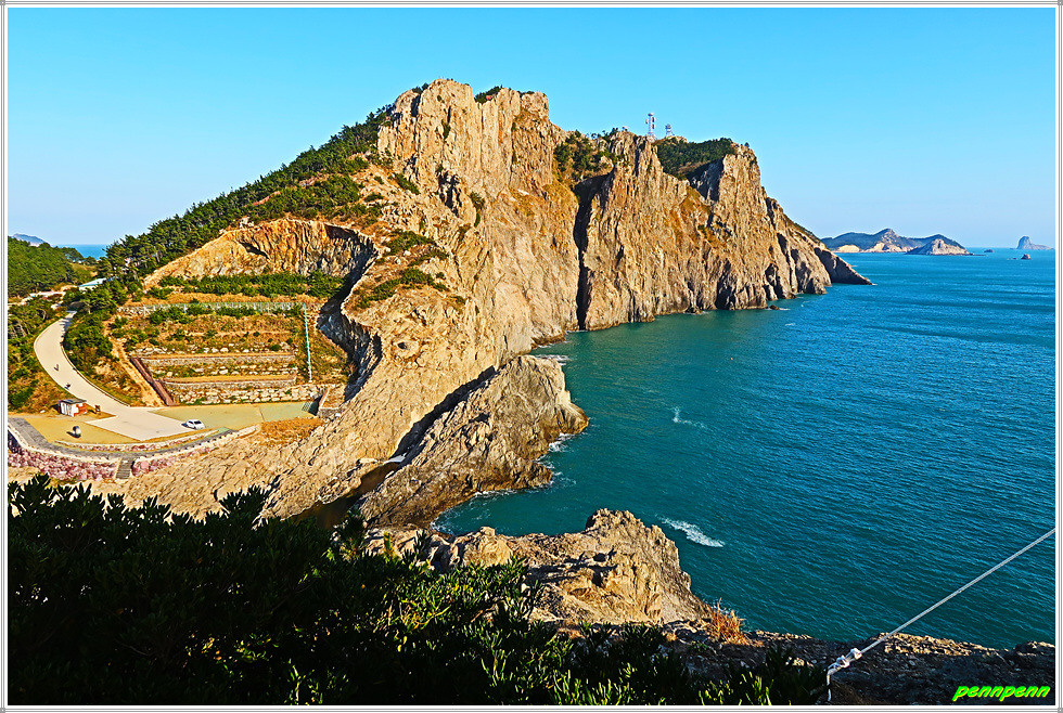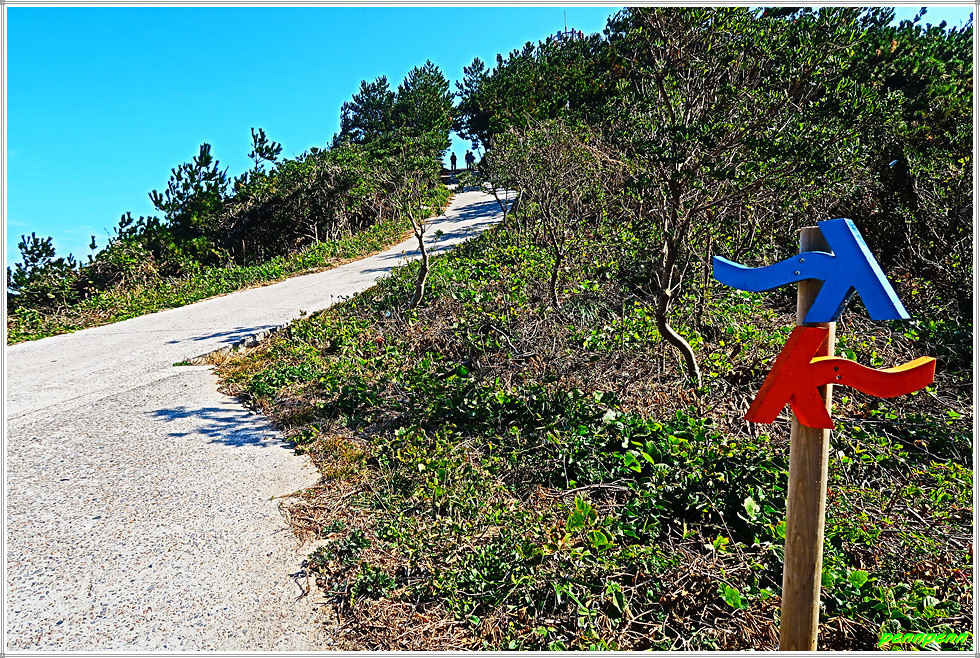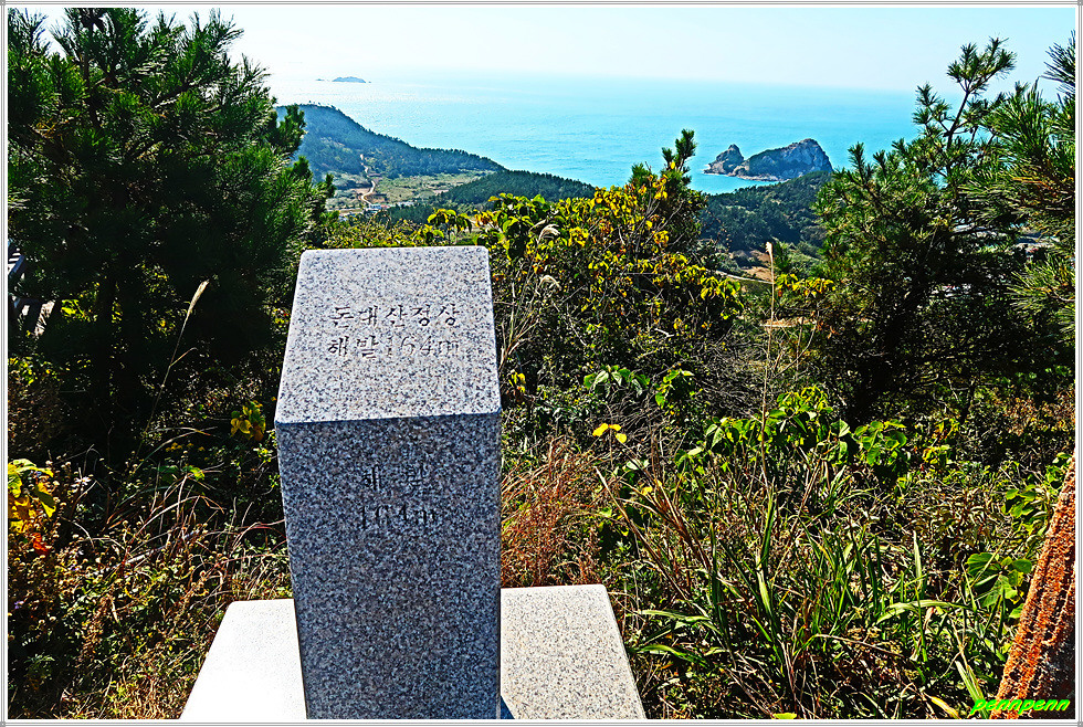 이젠 돈대산 해맞이길로 갈 차례입니다. 비스듬한 경사의 산길을 오르면 추자도의 최고봉인 돈대산(164m)입니다. 정상에는 정자(돈대정)와 표석이 있는데, 화강암에 새긴 표석은 글씨가 선명하지 않음이 아쉽습니다. 정상에 서니 산양항을 비롯해 남쪽으로 하추자도의 모습이 잘 조망됩니다.