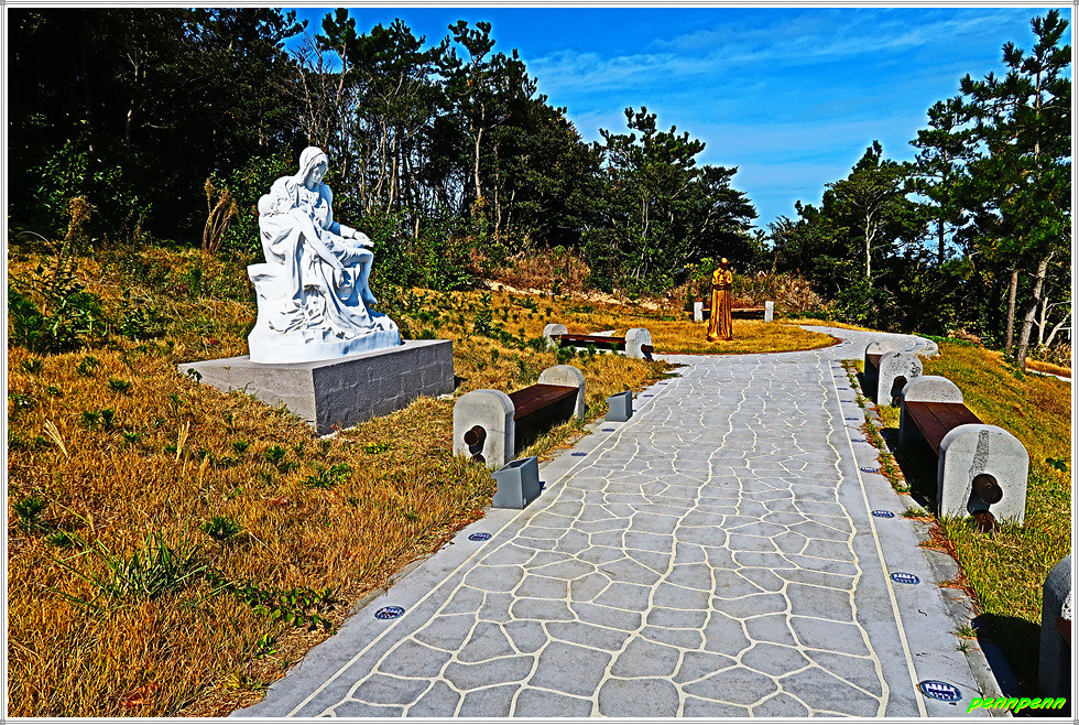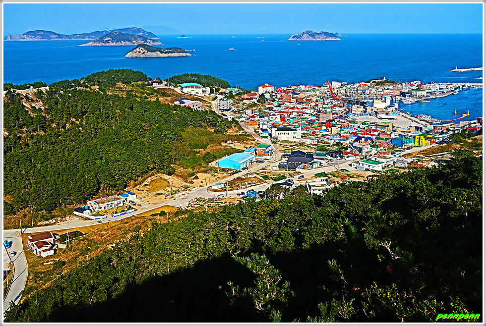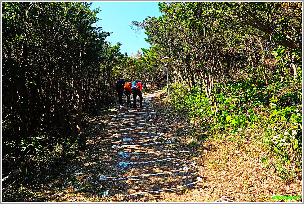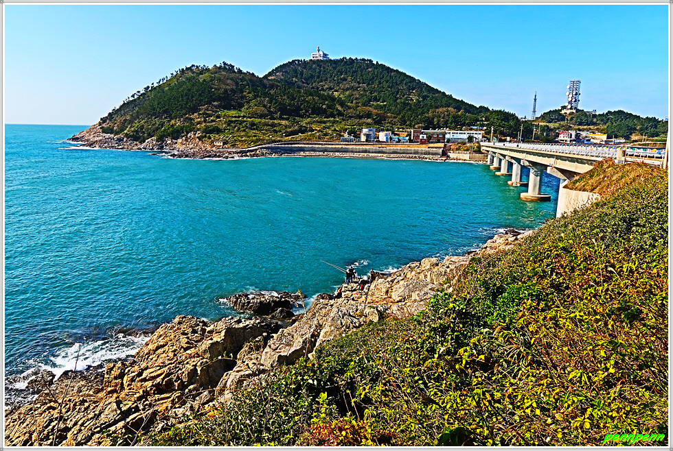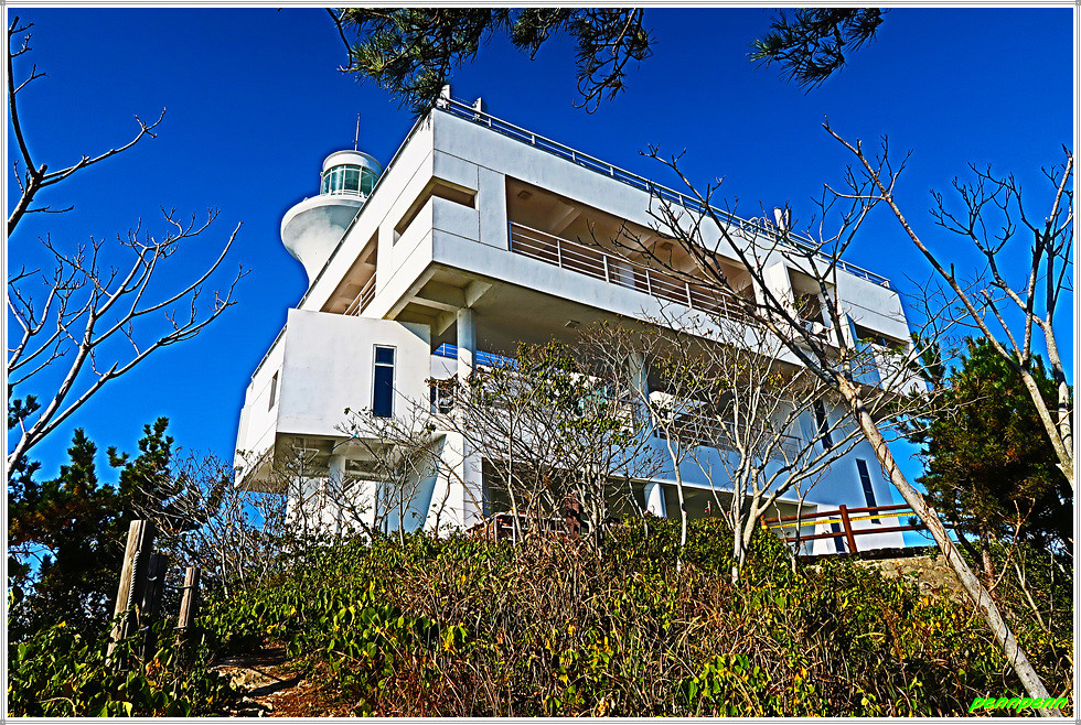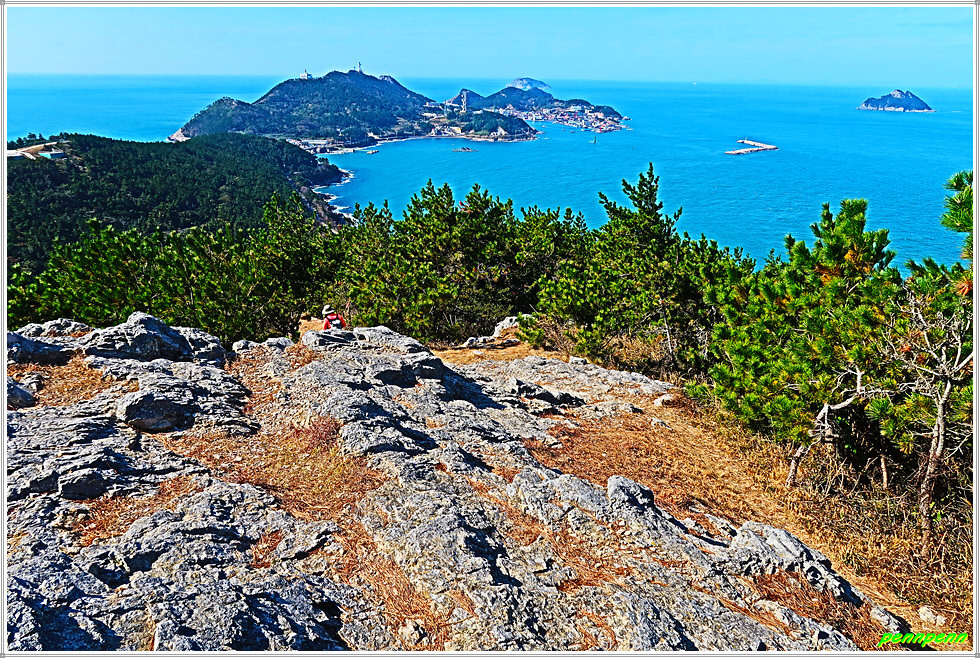 이젠 돈대산 해맞이길로 갈 차례입니다. 비스듬한 경사의 산길을 오르면 추자도의 최고봉인 돈대산(164m)입니다. 정상에는 정자(돈대정)와 표석이 있는데, 화강암에 새긴 표석은 글씨가 선명하지 않음이 아쉽습니다. 정상에 서니 산양항을 비롯해 남쪽으로 하추자도의 모습이 잘 조망됩니다.