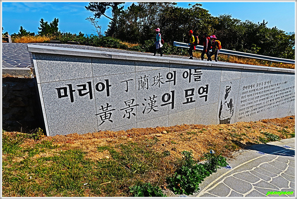 도로로 되돌아와 조금 더 가면 황경한의 묘와 모정의 쉼터입니다. 황경한(1800-?)은 신유박해 때 순교한 황사영(알렉시오)과 제주관노로 유배된 정약용의 조카 정난주(마리아) 부부의 아들입니다. 정난주는 신유박해 때 “황사영 백서”사건으로 남편을 잃고 두 살배기 아들 경한과 함께 제주도에 유배되었는데 호송선이 잠시 이곳 예초리에 머물자 정난주는 아들을 저고리로 싼 후 이름과 출생일을 적어 황새바위에 숨겼고, 경한은 어부 오씨에게 발견되어 자랐습니다. 황경한의 후손들은 지금도 하추자도에 살고 있으며, 황씨와 오씨는 한 집안과 같다고 해서 결혼하지 않는 풍습이 있다는군요