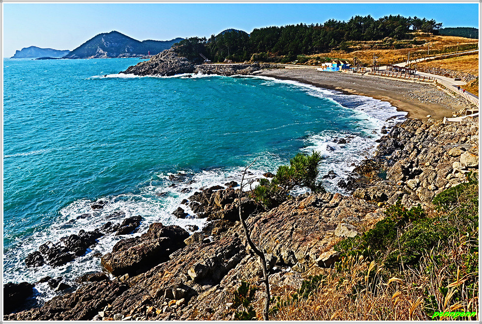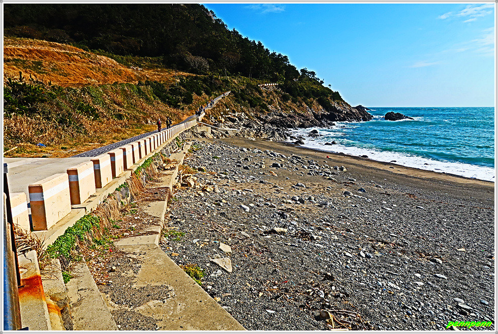 해수욕장에서 좌측 바닷가 길을 걷습니다. 길을 가면서 뒤돌아보면 모진이해수욕장의 풍경이 매우 아름답습니다. 한참을 가다가 다시 뒤돌아보니 시야가 더 넓어져 바다의 풍경은 더욱 광활하게 펼쳐집니다. 도로가 구부러지는 곳에서 우측으로 약 50여 미터 정도 나가면 조망대인데, 여기서 바라보는 바다풍경은 정말 시원합니다.