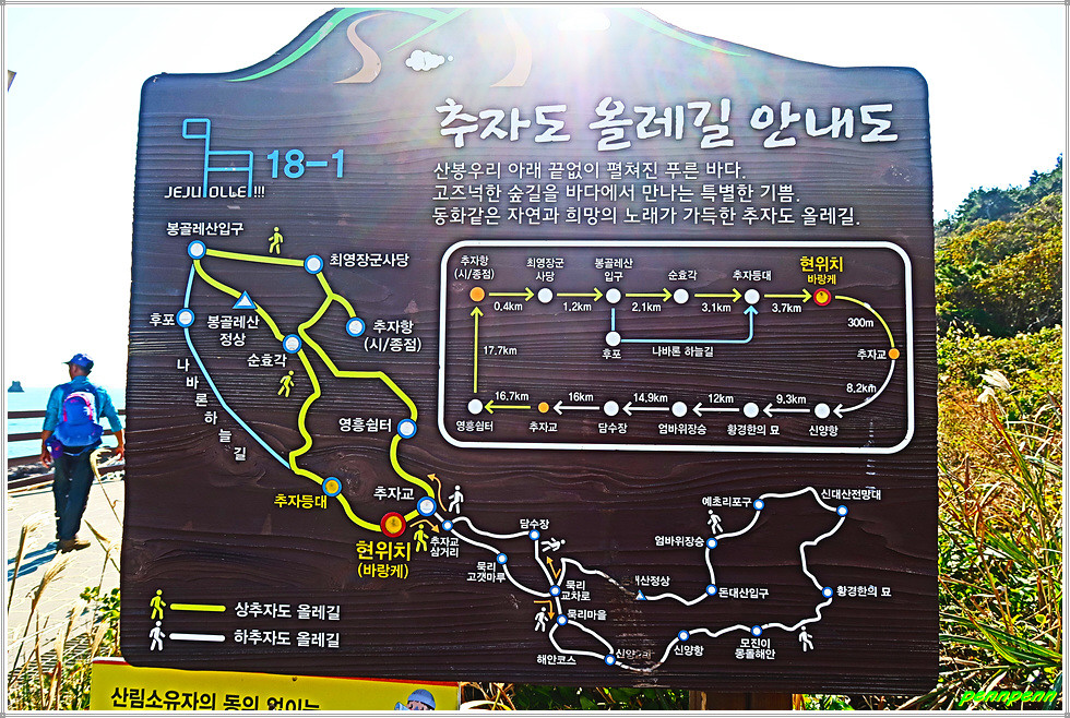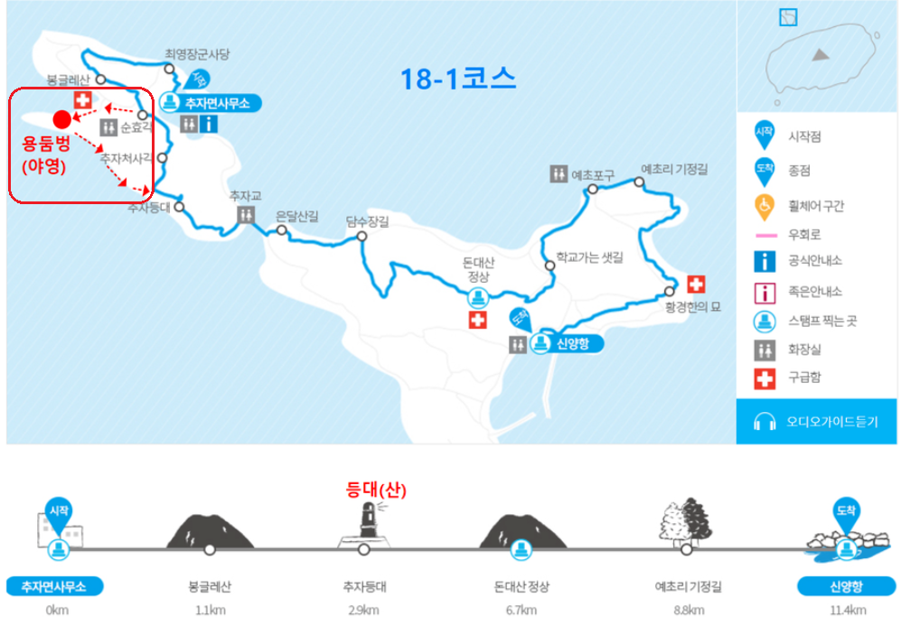 제주올레길 18-1코스는 하추자도의 신양항에서 출발해 황경한의 묘, 눈물의 십자가, 섬의 최고봉인 돈대산을 지나 추자대교를 건너 상추자도로 진입해 추자등대, 봉글레산, 최영장군 사당을 거쳐 추자면사무소에 이르는 11.4km의 도보길입니다.