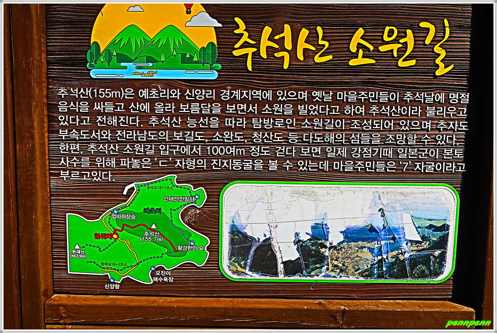 암바위 장승을 지나자 올레길은 좌측 돌계단으로 이어지는데 바로 학교로 가는 샛길입니다. 침목계단을 오르면 좌측에 추석산(156m) 일제진지동굴이 있다는 안내문이 있지만 시간의 제약으로 이를 생략합니다. 지나는 길목에는 추석산 소원길 안내문이 있는데, 추석산은 옛날 마을주민들이 추석날 명절음식을 싸들고 산에 올라 보름달을 보면서 소원을 빌었다고 해서 붙여진 이름이라는군요. 여기서 추석산을 오르면 아까 지나왔던 황경한 묘로 갈 수 있습니다.