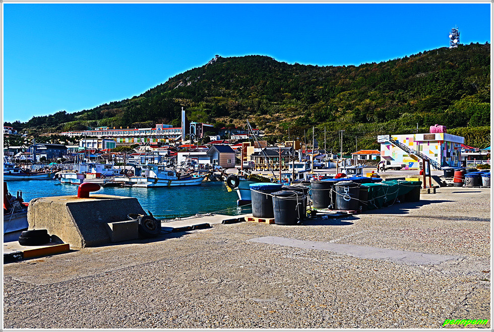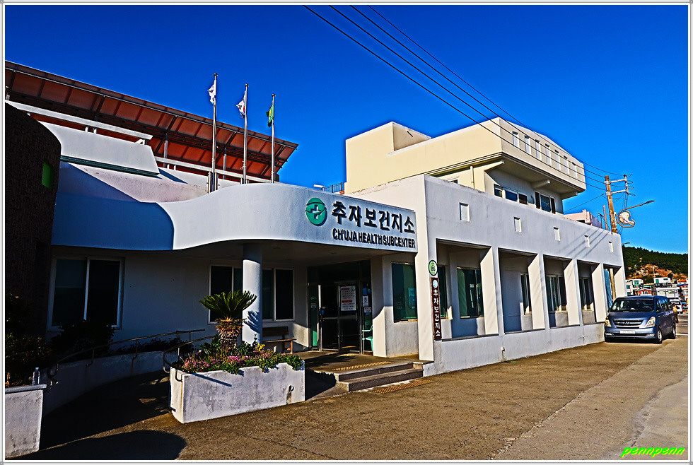 제주올레길 18-2코스는 상추자도의 추자면사무소에서 출발해 추자대교를 건너 하추자도 묵리수퍼, 대왕산 황금길을 거쳐 신양항에 이르는 10.2km의 도보길입니다. 18-2코스의 출발점은 원래 추자면사무소이지만 우리는 숙소인근 추자보건지소에서 출발합니다. 상추자도와 하추자도를 이어주는 가장 중심도로인 1114번 지방도로를 따라 가면서 상추자도항 포구를 바라봅니다. 포구 맞은편에는 등대산의 정자가 빤히 보입니다.
