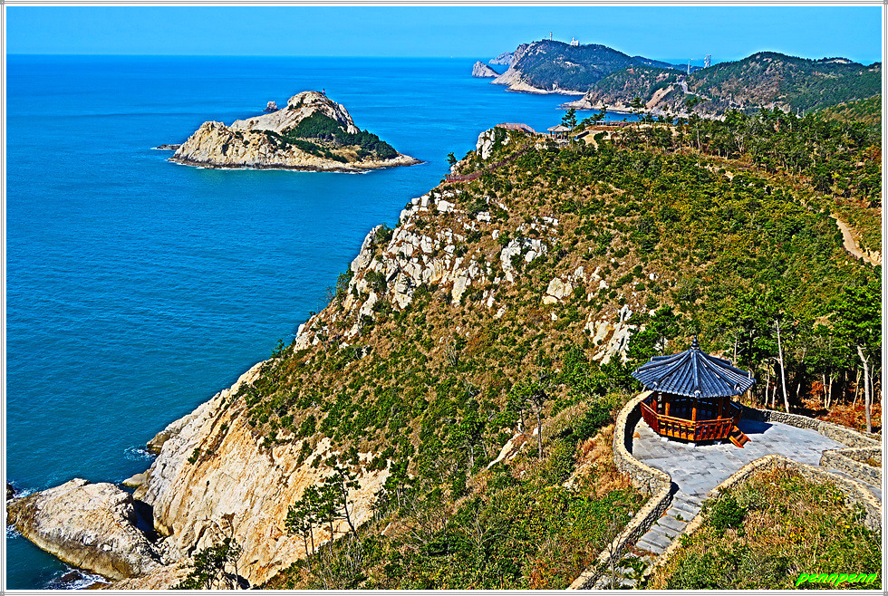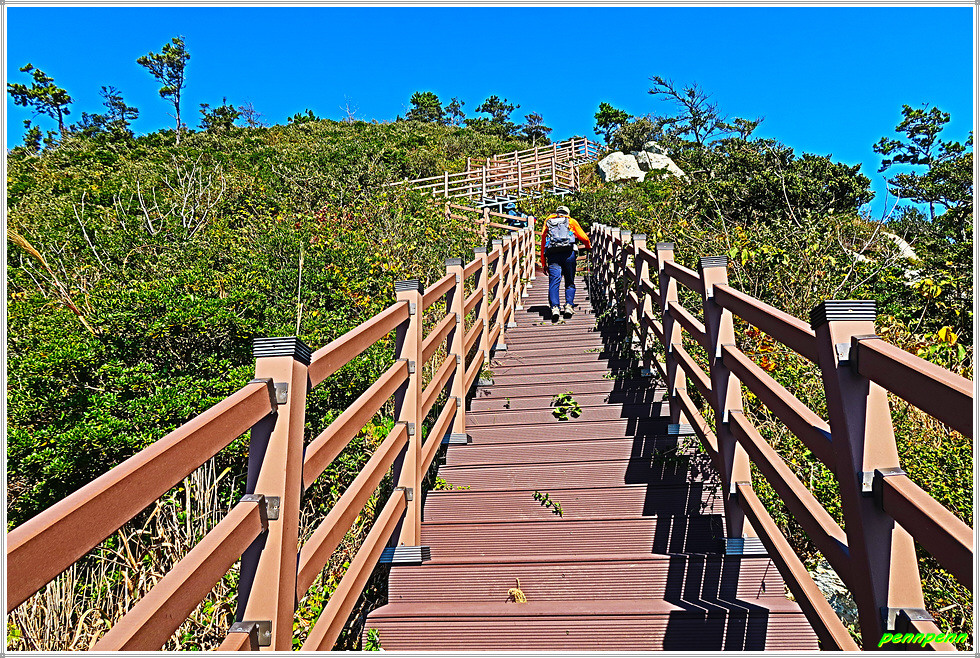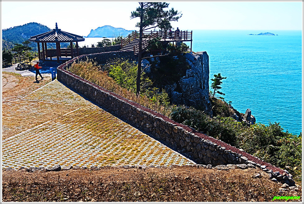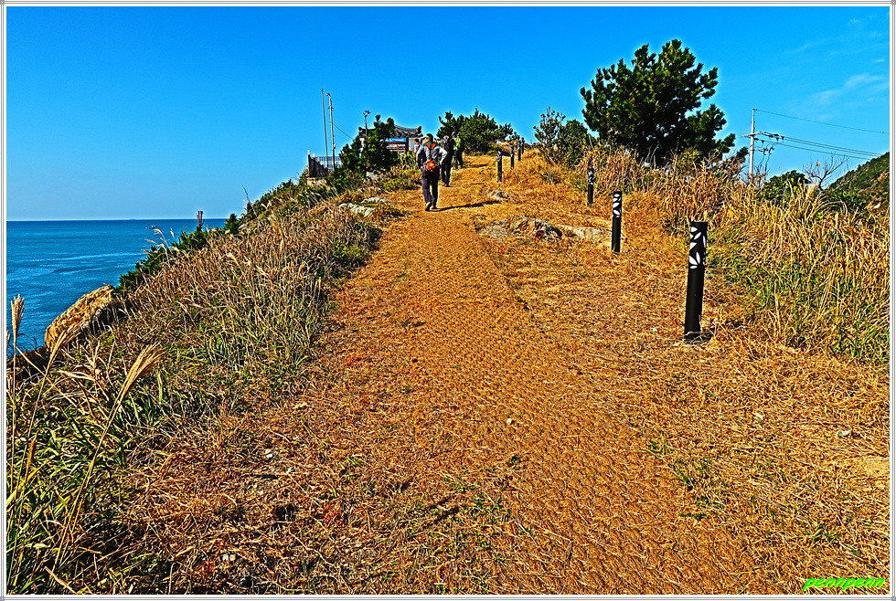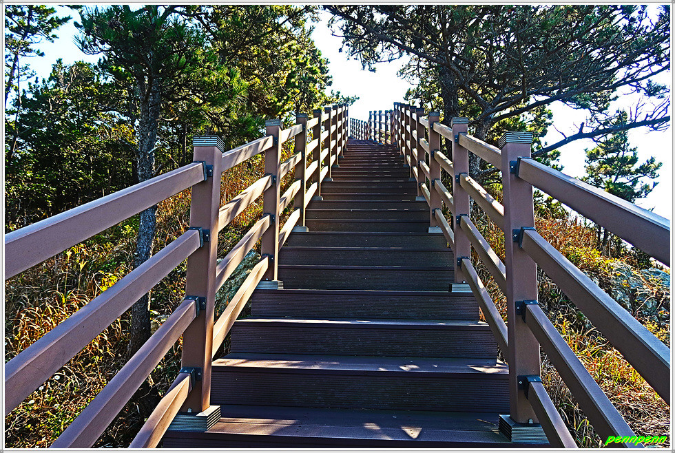 용들벙정을 뒤로하고 다시 가파른 계단을 오릅니다. 오르면서 뒤돌아보면 섬생이와 추자도의 아름다운 해안선을 보면서 감탄이 저절로 나옵니다. 마지막으로 목제계단을 치고 오르면 대왕산(125m) 정상인데 이 길은 대왕산 황금길이기도 합니다.