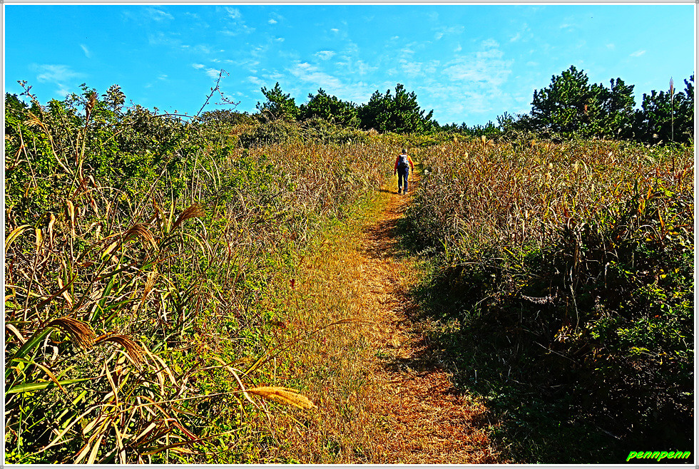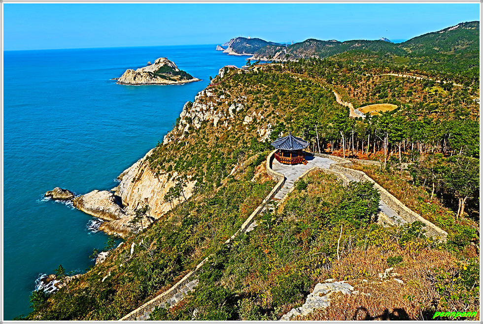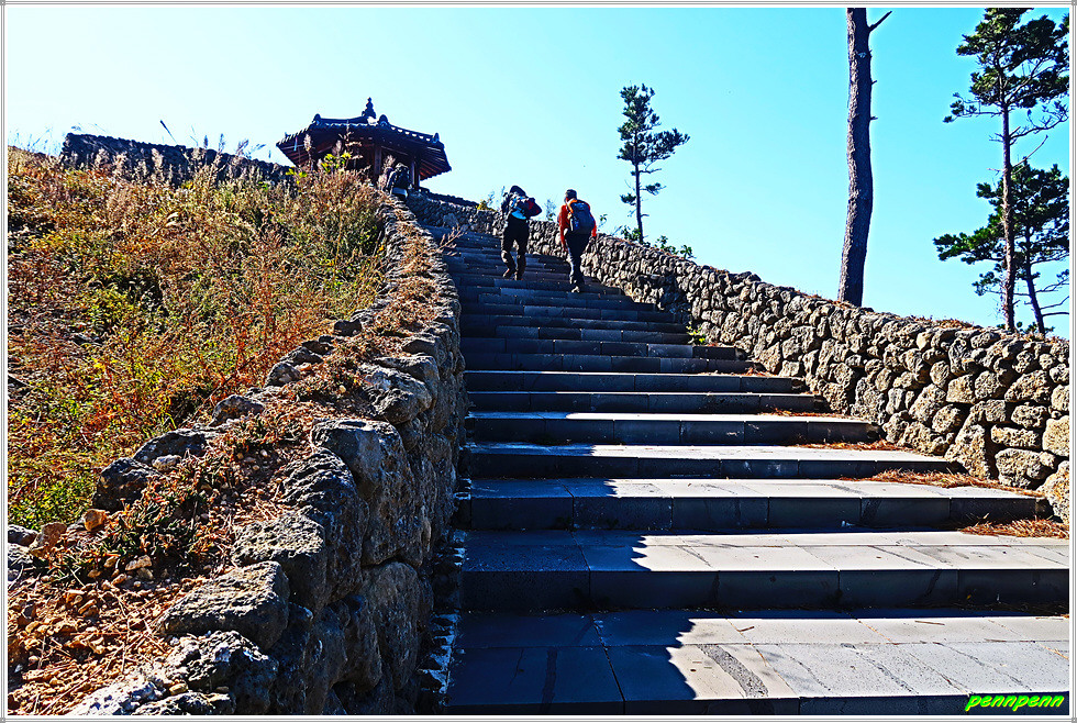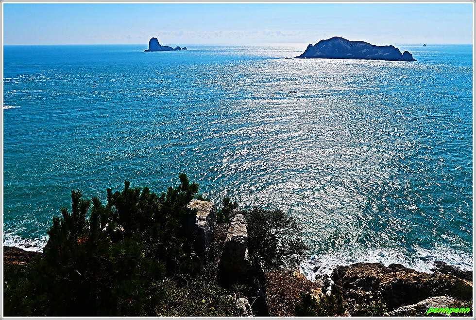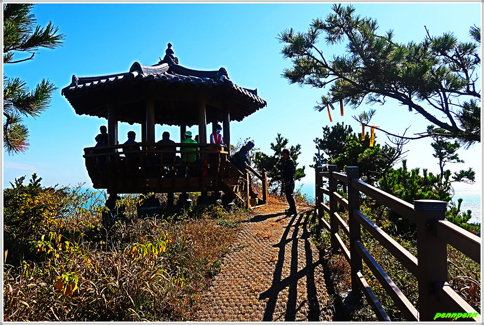 용들벙정을 뒤로하고 다시 가파른 계단을 오릅니다. 오르면서 뒤돌아보면 섬생이와 추자도의 아름다운 해안선을 보면서 감탄이 저절로 나옵니다. 마지막으로 목제계단을 치고 오르면 대왕산(125m) 정상인데 이 길은 대왕산 황금길이기도 합니다.