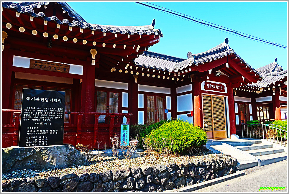 처녀당을 나와 지방도로에서 좌측 숲으로 들어섭니다. 해안가에 솟은 섬은 섬생이라는 독특한 이름을 가졌군요. 숲길을 걸으며 뒤돌아보니 방금 지나온 처녀당의 정자가 저만치 멀어져 있습니다. 발걸음을 옮기노라니 아까 보웅리 한 개로 보이던 섬생이의 봉우리가 두 개입니다. 나지막한 고개를 넘어가면 신양2리마을인데 마을회관 앞에는 신성한 곳임을 뜻하는 홍살문과 유사한 문을 세워둔 게 매우 이색적입니다.