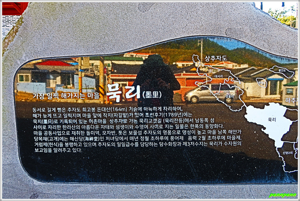 지금 걷는 이 길은 묵리고갯길입니다. 추자도에서 가장 큰 마을인 묵리는 마을의 앞과 뒤가 산에 둘러싸여 있어 다른 마을에 비해 해가 늦게 뜨는 고요한 마을입니다. 묵리로 넘어가는 고갯길은 섬이 아니라 깊은 산 중에 들어와 있는 듯한 느낌을 주는 아늑하고 아름다운 숲길로 18-2코스를 개설하면서 새롭게 이은 길입니다. 숲길을 벗어나 묵리수퍼 옆 쉼터에서 잠시 쉬어 갑니다.