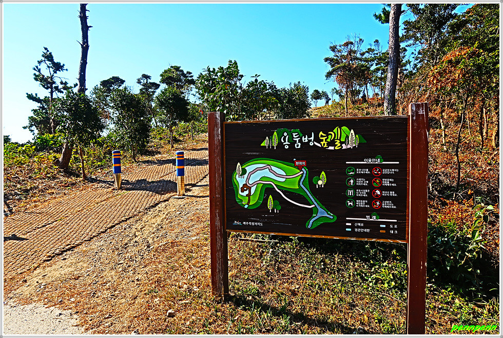 이제부터 목적지는 대왕산입니다. 길목에는 철이 지난 코스모스가 화사하게 피어 있군요. 이제부터는 용둠벙 숲길을 걷습니다. 정자에서 보는 섬생이와 하추자도의 서쪽 해안선이 정말 아름답습니다. 정자를 뒤로하고 용둠벙(용이 살던 연못)의 용 벽화가 새겨진 곳을 지나면 용등벙정입니다. 용이 살던 웅덩이의 정식 명칭은 용둠벙인데 정자의 현판이 용등벙인 이유를 잘 모르겠네요.