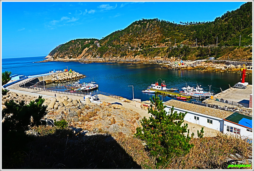 전망데크에서 내려오면 석두청산 쉼터인데 석두청산은 하추자도 남쪽의 동쪽에 자리잡은 산입니다. 쉼터에서 좌측 숲길을 통과하면 신양항 포구가 보입니다. 원래 길은 좌측이지만 호기심에서 우측으로 조금 들어갑니다. 바닷가에는 쑥부쟁이가 무리를 지어 피어 있군요. 그런데 여기서 더 이상 해안성을 따라 가는 길은 정비가 되어 있지 않아 불가능해 원래 길로 되돌아 나옵니다.