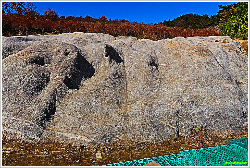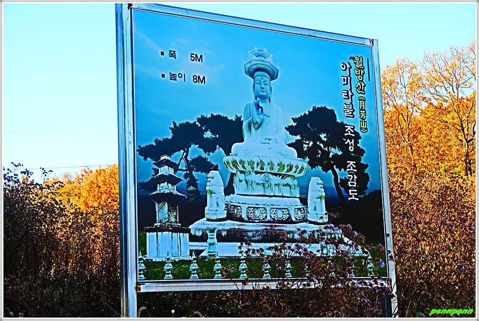 비보림의 두꺼비바위를 지나면 한 때 무성하게 피었던 개미취가 거의 시든 모습이며, 그 안쪽은 주차장입니다. 주차장 좌측 끝에는 월방산 아미타불 조성을 위한 조감도가 세워져 있군요. 그 옆의 큰 바위는 오백나한이라고 불리는 곳입니다. 오백나한상은 깨달음을 얻어 아라한과를 이룬 불교 수행자 500인의 모습을 표현한 그림이나 조각을 말하는데 이 바위를 오백나한으로 이름 붙인 것을 보면 상상력이 매우 풍부해 보입니다.