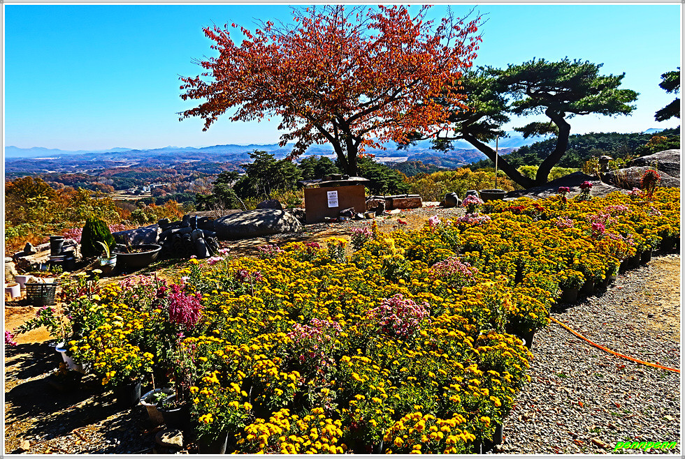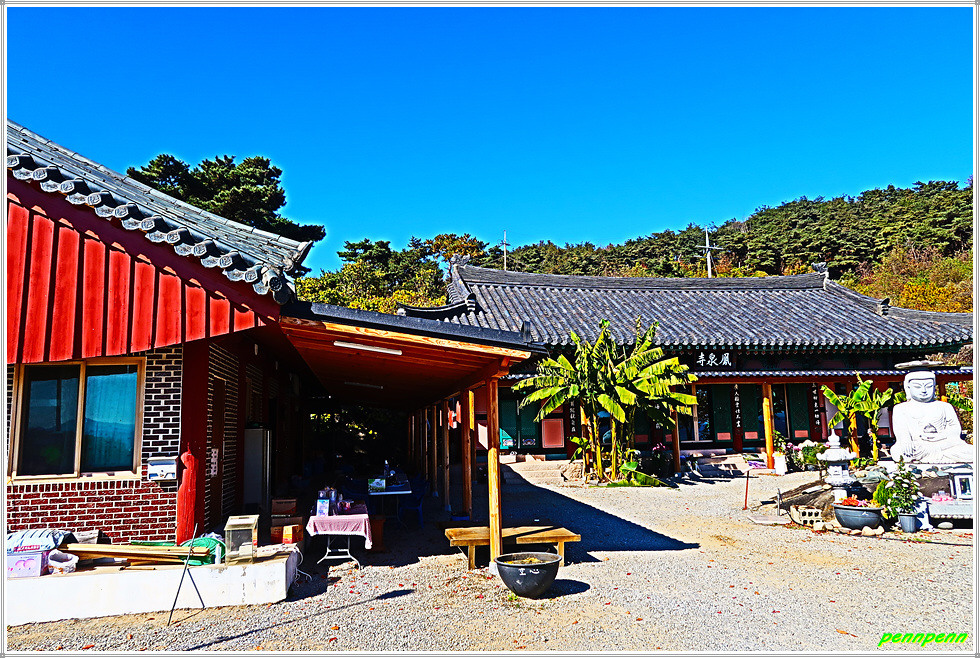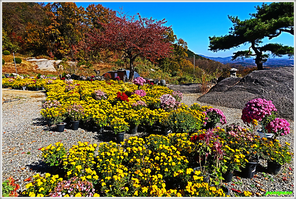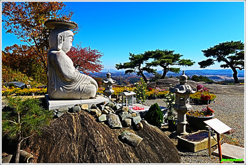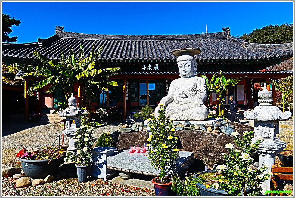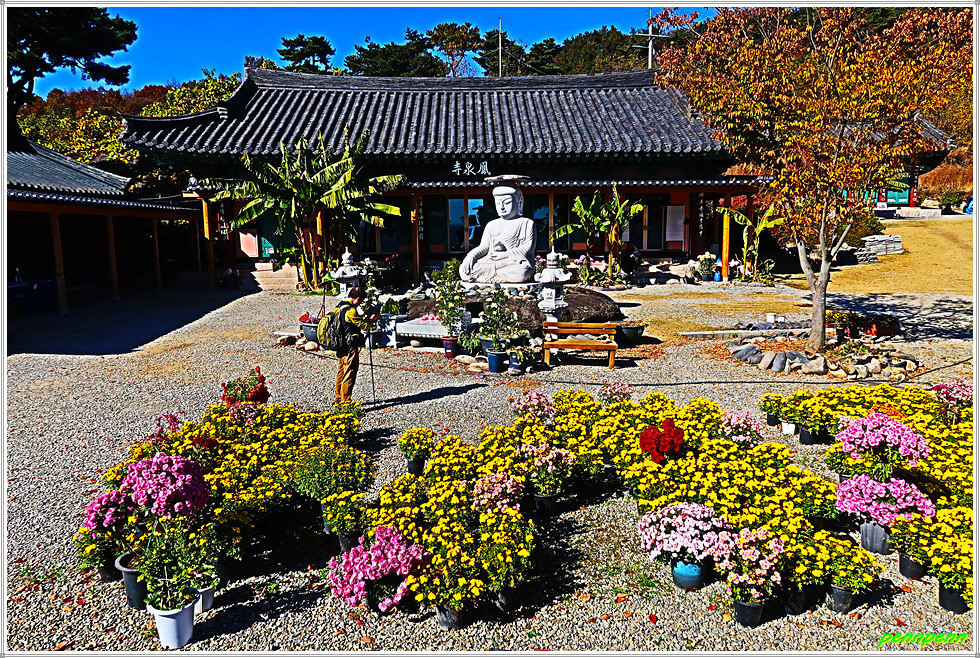 병암정을 뒤로하고 사찰 경내로 들어서면 좌측에는 종무소, 가운데는 법당이 있습니다. 법당 앞에는 약사여래불좌상이 있고 마당에는 국화전이 열리고 있는 모습입니다. 가을이 되면 봉천사 일원은 개미취가 지천으로 피어 있어 사진애호가들이 모여드는 곳이지요. 지금은 늦가을이라 개미취는 져버리고 없지만 화사한 국화가 방문객을 맞아주는군요. 사찰 마당의 불상과 국화꽃이 어우러져 환상적인 아름다움을 가져다줍니다.