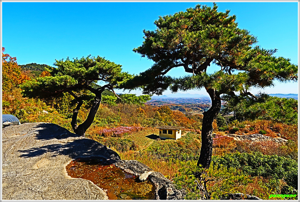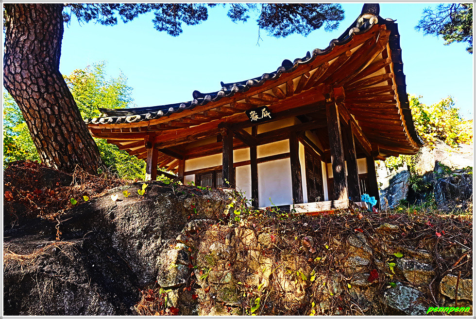 봉천사 법당 뒤에는 삼성각이 있는데, 삼성각은 사찰에서 산신·칠성·독성을 함께 봉안하는 불교건축물입니다. 독성각은 불교에서 말하는 독각(獨覺)을 모신 곳으로 독각은 석가모니처럼 스승 없이 홀로 깨우친 자를 말합니다. 산신각은 단군이 산신이 되었다는 전설에서 유래하는 산신을 모신 곳입니다. 칠성각은 북두칠성에 축원하는 도교의 신앙을 받아들여 북두칠성을 불교의 여래로 조화하여 모신 곳입니다. 삼성각 앞에는 아까 보았던 병암정과 소나무 사진이 놓여 있군요.
