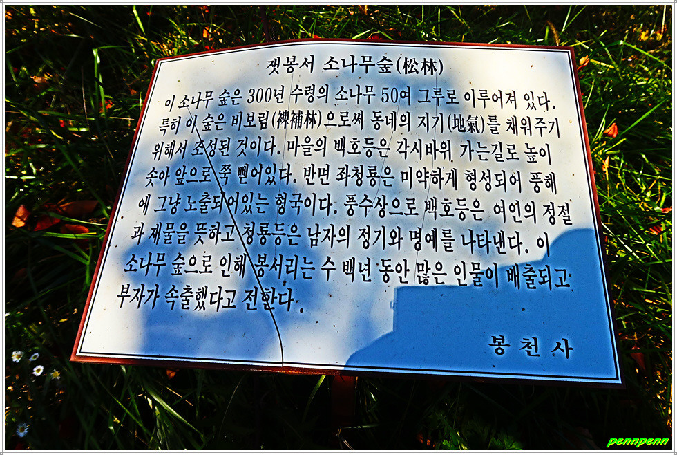 봉서2리 마을표석이 있는 곳에서 450m 지점에 마애관음보살상과 약사여래상이 있다고 하지만 여기까지 가볼 시간적 여유는 없습니다. 사찰 바로 입구에는 봉천사 표석과 잿봉서 소나무숲이 있는데, 이 숲은 수령 300년이 넘는 50여 그루의 비보림 소나무로 이로 인해 봉서리는 수백 년 동안 많은 인재가 배출되고 부자가 속출했다고 전합니다.