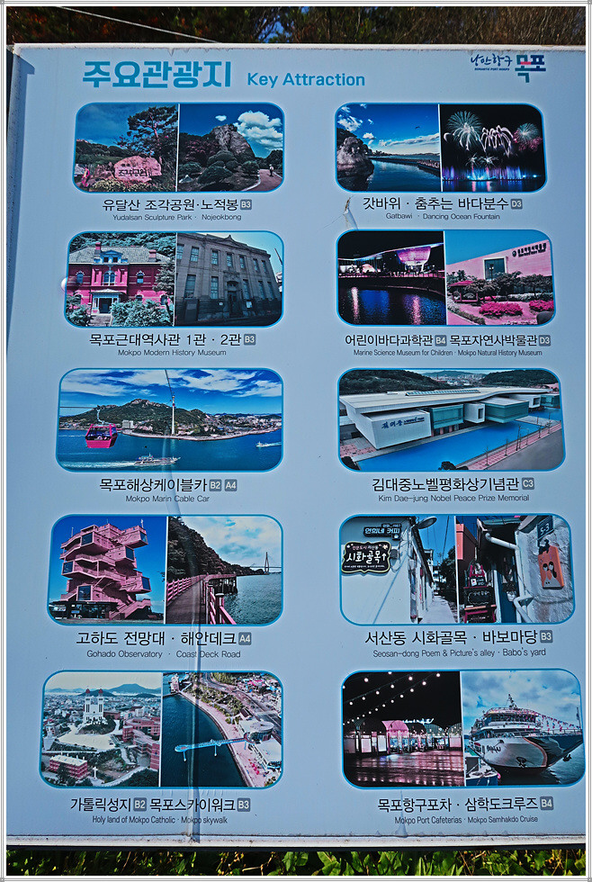 달맞이공원 주차장 갓바위 진입로에는 갓바위 표석, 목포 9경, 물고기 조형물 등이 있는데, 여기서 갓바위까지는 영산강변을 따라 수상보행교(약 300m)가 설치되어 있어 물 위에서 갓바위의 모습을 생생하게 감상할 수 있습니다.