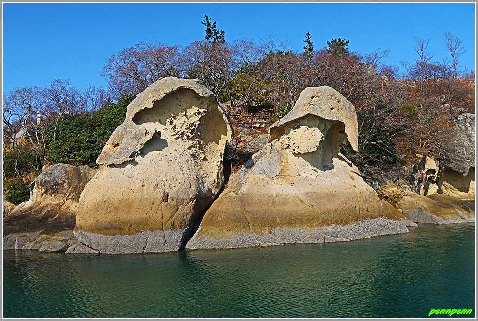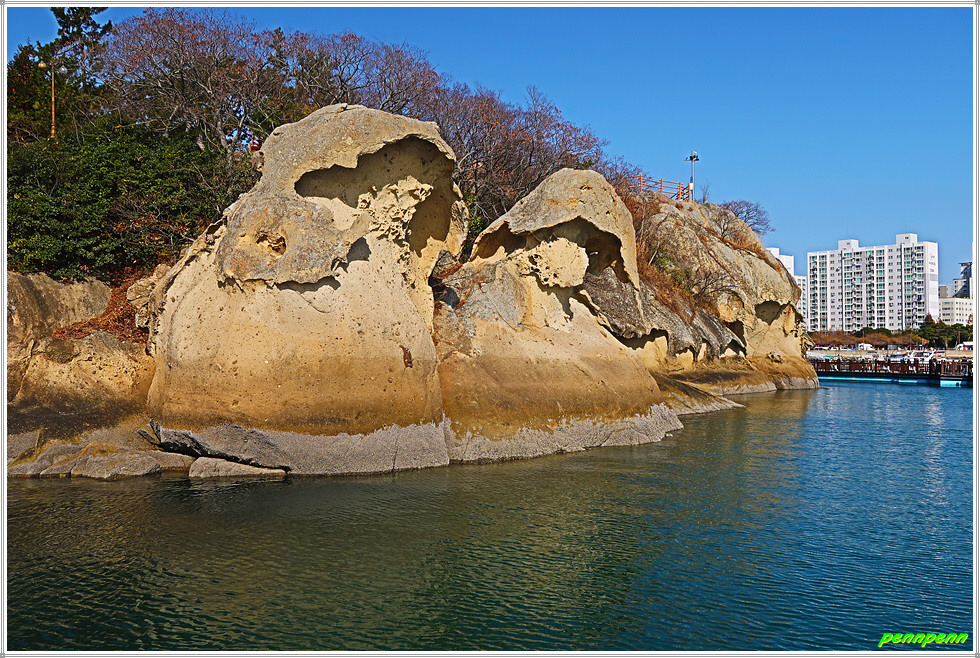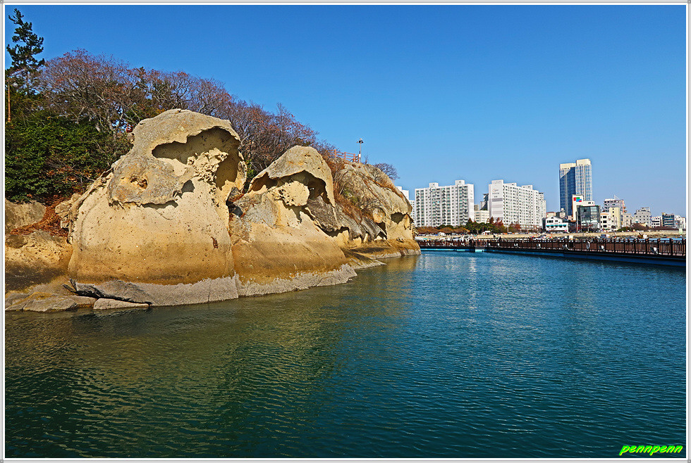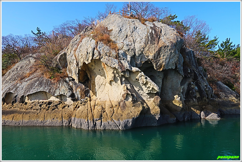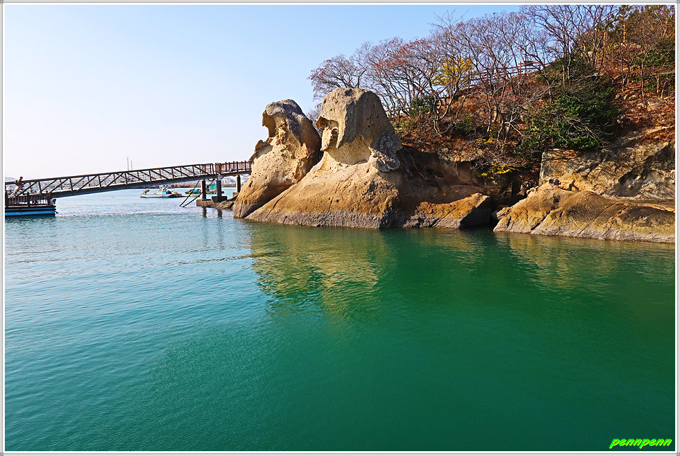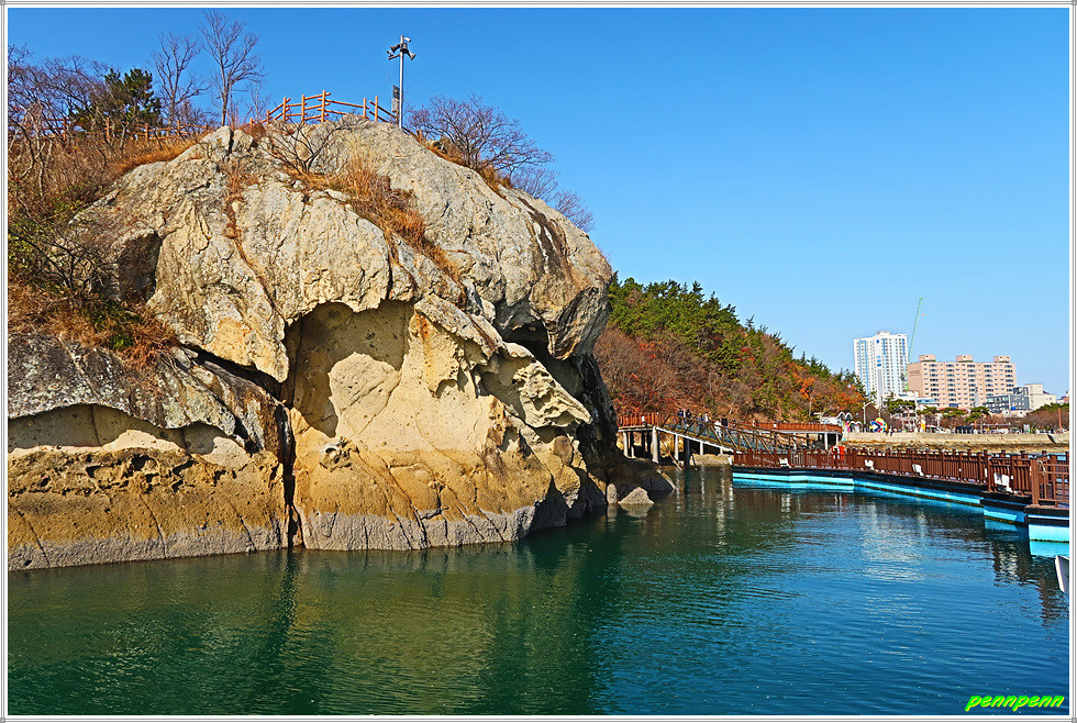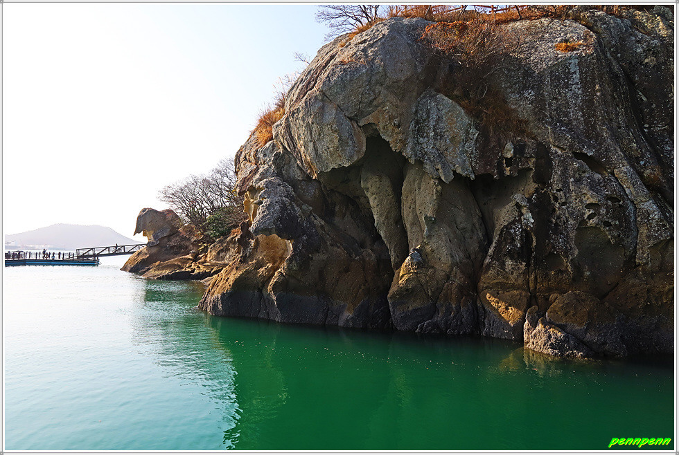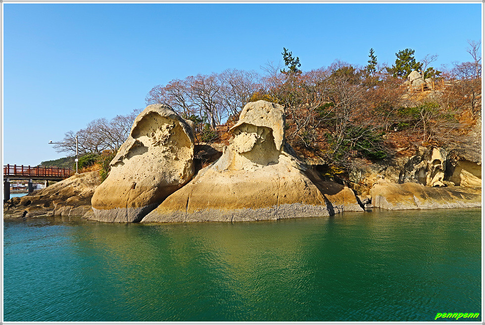 수상보행교를 따라 가노라면 기암의 모습이 보이기 시작하는데, 모퉁이를 돌아가면 바로 한상의 바위가 모습을 드러냅니다. 이와 같은 기암은 긴 세월동안 파도에 의한 침식작용과 소금에 의한 화학적 풍화작용에 의하여 형성되었습니다. 상단부에 갓 모습과 그 하부에 움푹 패인 풍화혈 등의 모습으로 인해 매우 아름다운 지형경관을 보여줍니다.