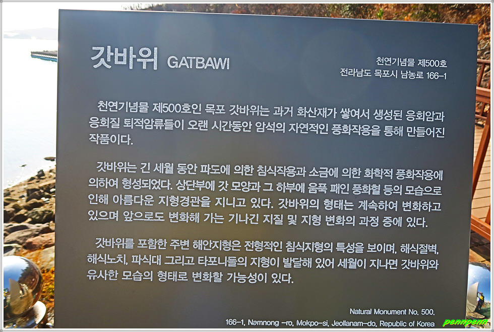 갓바위를 돌아가면 맞은편 강변에 목포문화의 거리에 있는 국립해양문화재연구소 건물이 보이고 입암산(122m)의 암봉도 우뚝합니다. 도로로 나오면 이쪽에서 갓바위로 가는 이정표가 있지만 필자가 걸은 것처럼 달맞이공원 갓바위주차장에서 수상보행교를 이용할 것을 권장합니다.