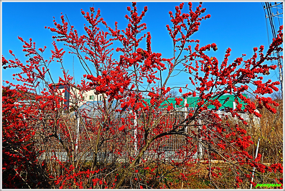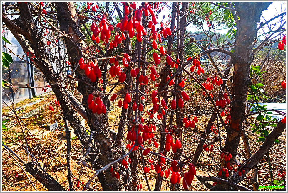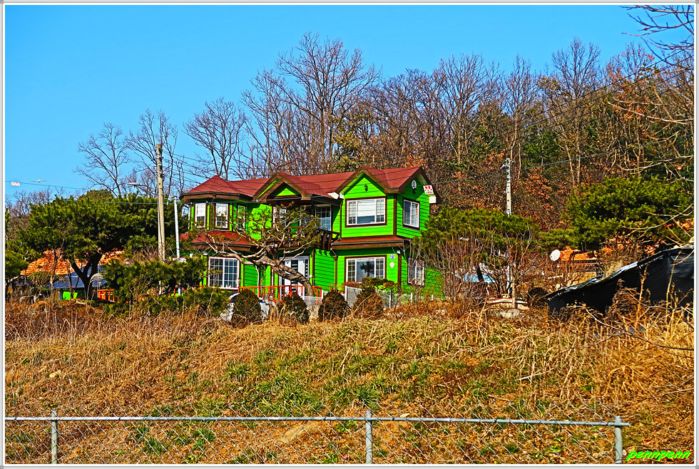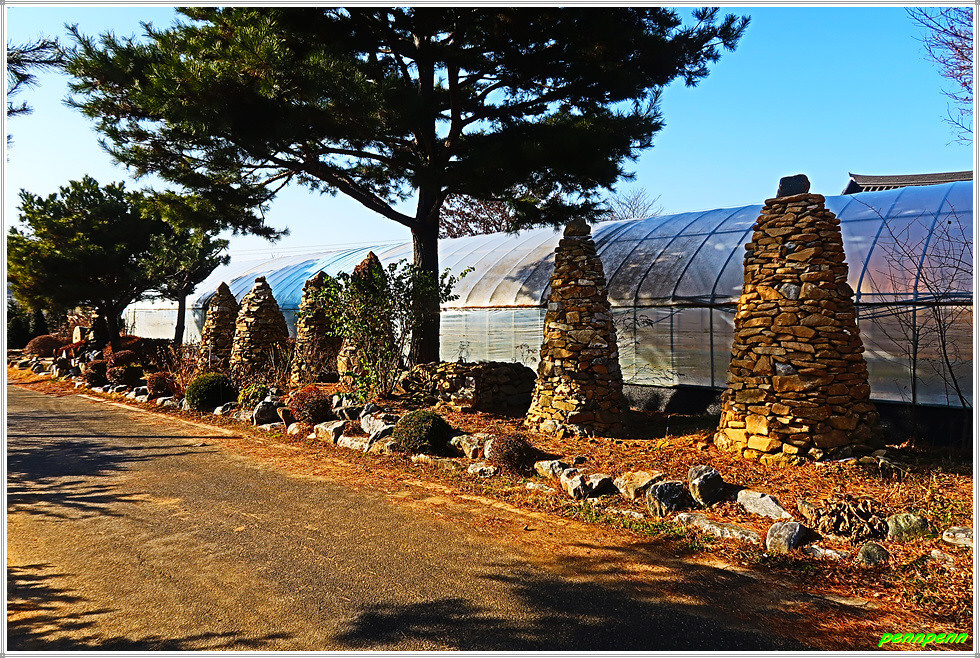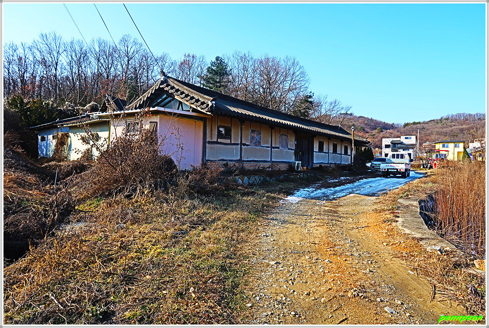 누군가 정성을 들려 쌓은 돌탑군을 뒤로하면 산수유가 열매를 맺고 있군요. 눈이 부실만큼 빨간 백량금의 열매가 여행자의 발길을 사로잡습니다. 두운2리마을회관 옆길을 따라가면서 두운2리 장안마을회관을 지나갑니다. 비슷한 이름의 마을회관이 둘이로군요. 길을 가면서 좌측 언덕을 바라보니 그야말로 그림 같은 녹색의 전원주택이 보이는데 이곳에는 동화 속 인물이 살고 있을 것만 같습니다.