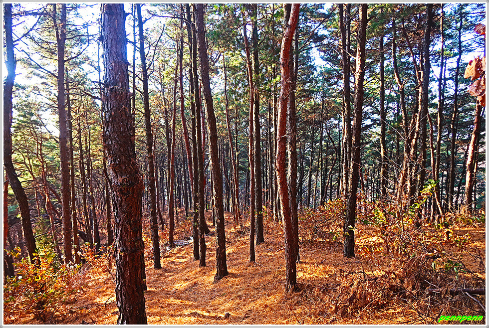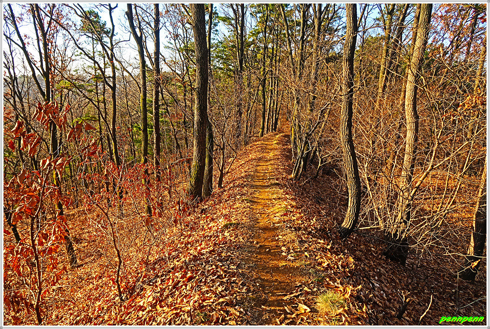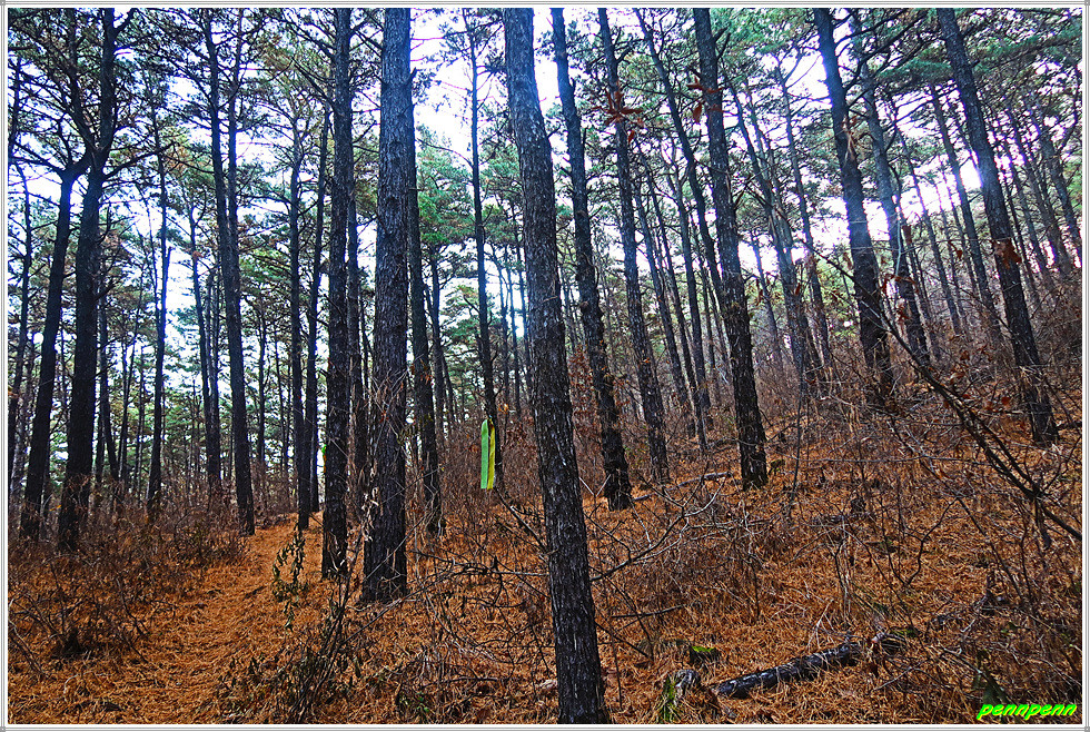 산길은 U자형으로 돌아 능선으로 이어지다가 국원리 방면의 이정표를 보고 좌측으로 방향을 바꿉니다. 소나무숲길을 걸으며 우측을 바라보니 고려산 남쪽의 혈구산(466m)이 우뚝하네요. 소나무 숲길을 빠져 나오니 드디어 선원사지입니다.