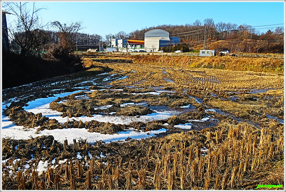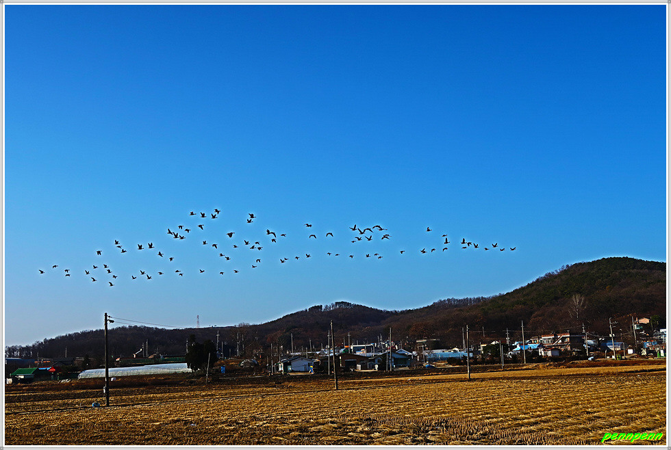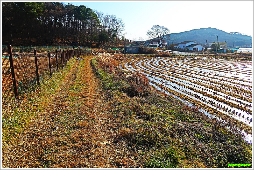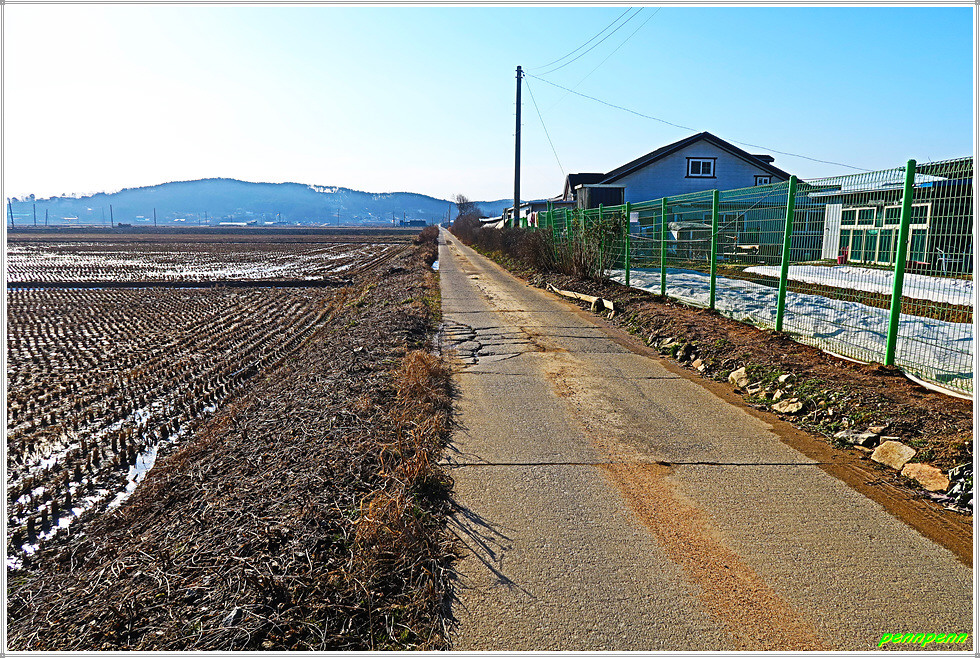 연리보건진료소를 지나 좌측의 숲으로 들어선 다음 잠시 후 숲을 빠져나와 남쪽으로 이어진 일직선 도로를 걷습니다. 상암동천에 걸린 다리를 건너 계속 가는 데 갑자기 옆의 논에서 철새 떼가 날아오릅니다. 철새들이 필자의 인기척 소리를 들은 모양입니다. 얼른 카메라를 꺼내 이들을 담았습니다. 농로를 지나가며 환경농업교육원(?)으로 추측되는 건축물을 봅니다.