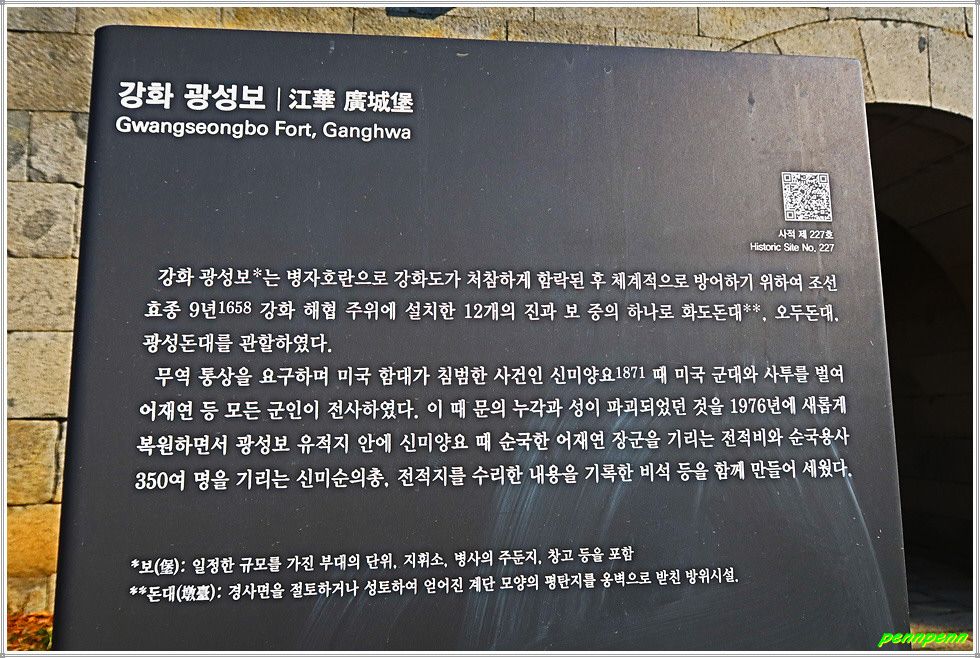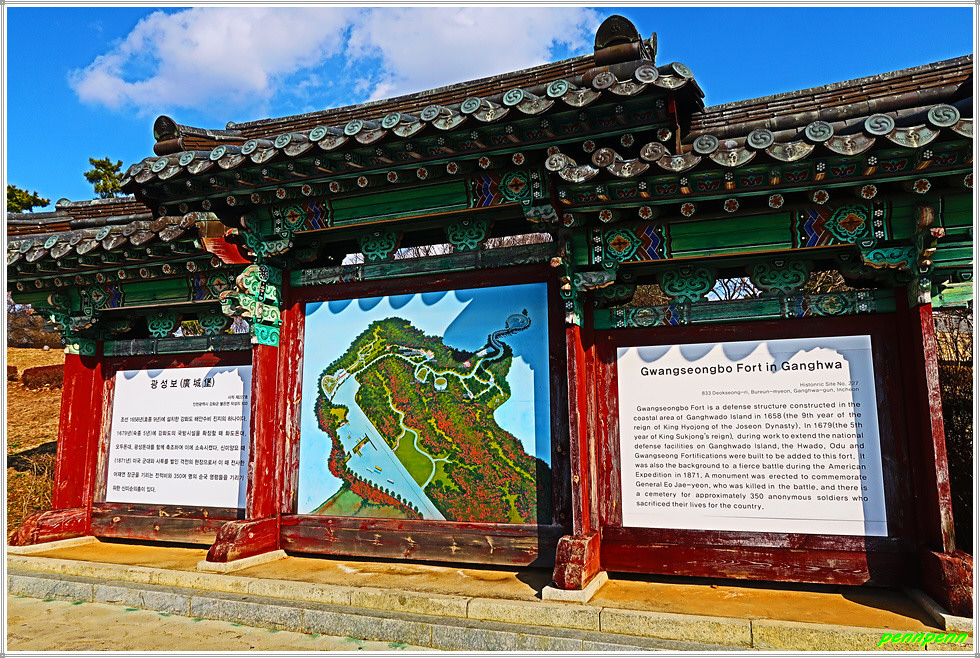 송전청탑을 뒤로하고 아취형 대문을 지나 광성보교차로에 있는 어재연장군에게 경의를 표한 후 좌측으로 들어가면 광성보입니다. 광성보(사적 제227호)는 강화의 해안경계부대인 12진보가운데 하나로 1658년 설치되었습니다. 신미양요(1871)때 광성보는 치열한 전투가 벌어진 격전지로 해병 450명으로 초지진과 덕진진을 점령한 미군은 극동함대의 함포 지원사격을 받으며 광성보로 쳐들어왔습니다. 조선군은 화력의 열세에도 끝까지 싸워 중군장 어재연과 그의 아우 어재순, 군관을 비롯한 49인의 장사와 200여명의 군사가 전사했습니다. 이때 파괴된 누각과 성곽 등은 1976년 복원되었으며, 현재 광성보에는 어재연 등 장수들의 용맹을 기린 쌍충비각과 무명 병사들의 무훈을 기린 무명용사비가 있습니다. 또한 이곳에는 광성돈대, 손돌목 돈대, 용두돈대가 있습니다.
