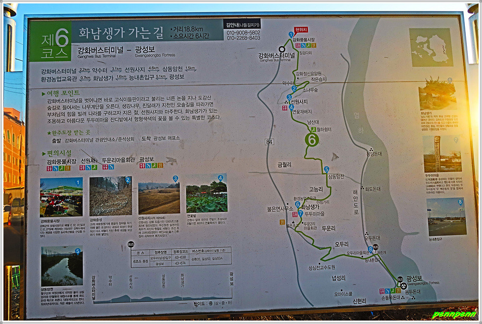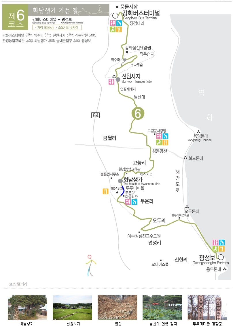 ▲ 코스 : 강화버스터미널-강화풍물시장 입구-동락천-강화정신요양원-소나무숲-선원사지(선원사)-상암동천-화남생가(추정)-두운2리마을회관-숲길-오두보건진료소-강화해변-광성보