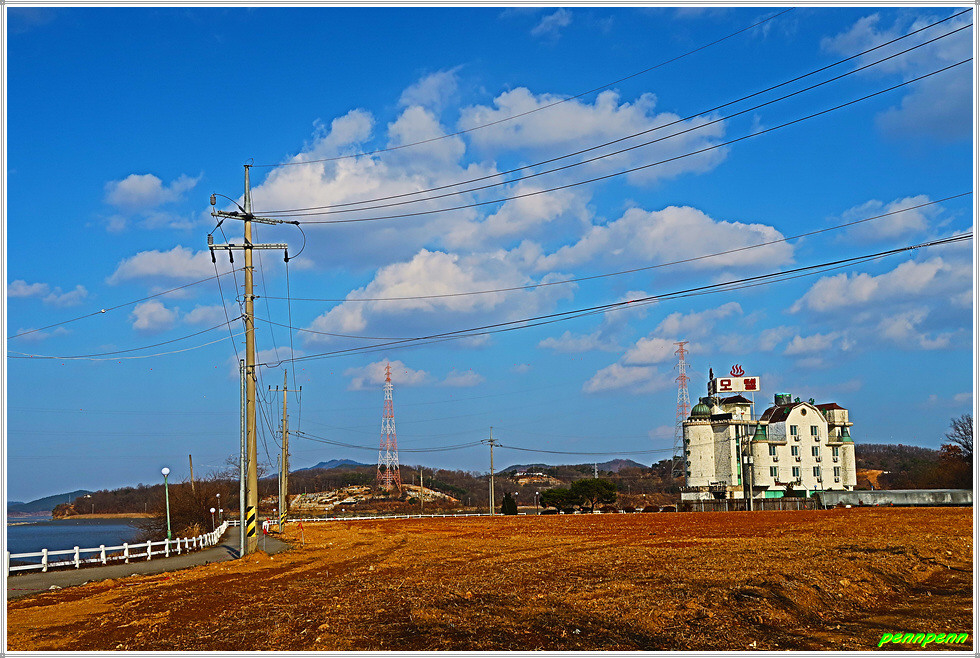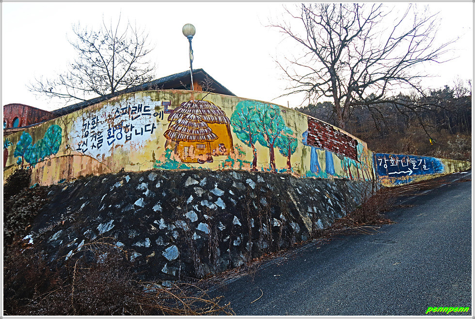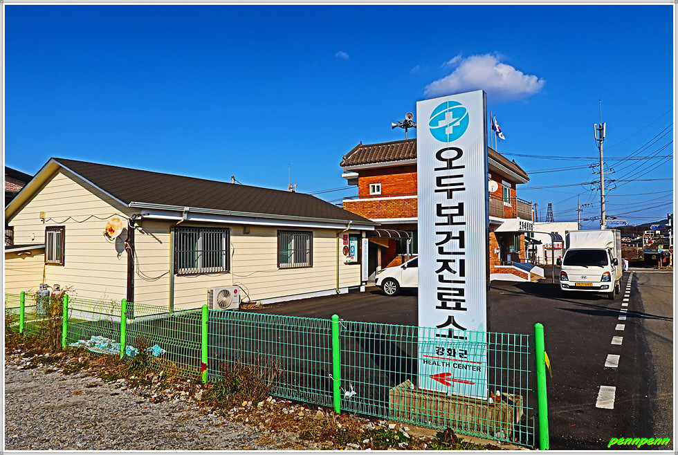 사북천을 가로지르는 다리를 건너 좌측으로 가다가 붉은 지붕의 건물에서 우측 산으로 들어섭니다. 오늘 나들길의 반 정도는 숲길인 듯합니다. 오두리 간이상수도시설에서 좌측으로 몸을 돌려세운 후 숲을 나와 오두보건진료소 및 오두리경노당을 지나 우측 동남쪽으로 뻗는 일직선 도로를 따라 걷습니다. 강화해안도로를 가로지르면 강화해변인데 이 길은 강화나들길 2코스(호국돈대길)와 만나는 길이어서 눈에 익습니다. 여기서부터 광성보까지는 2코스와 6코스가 함께 가는 길입니다.