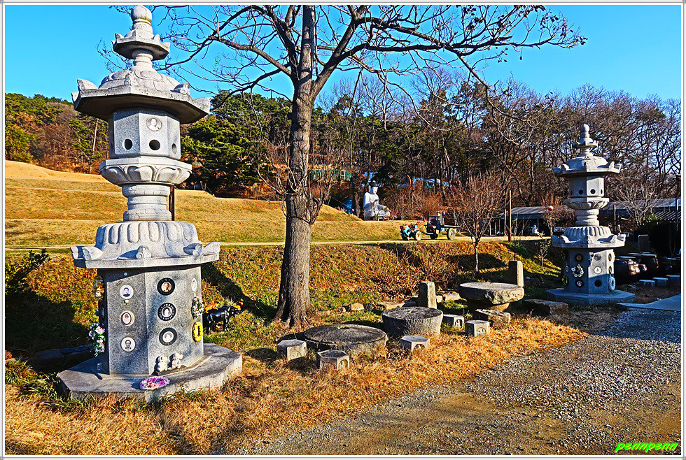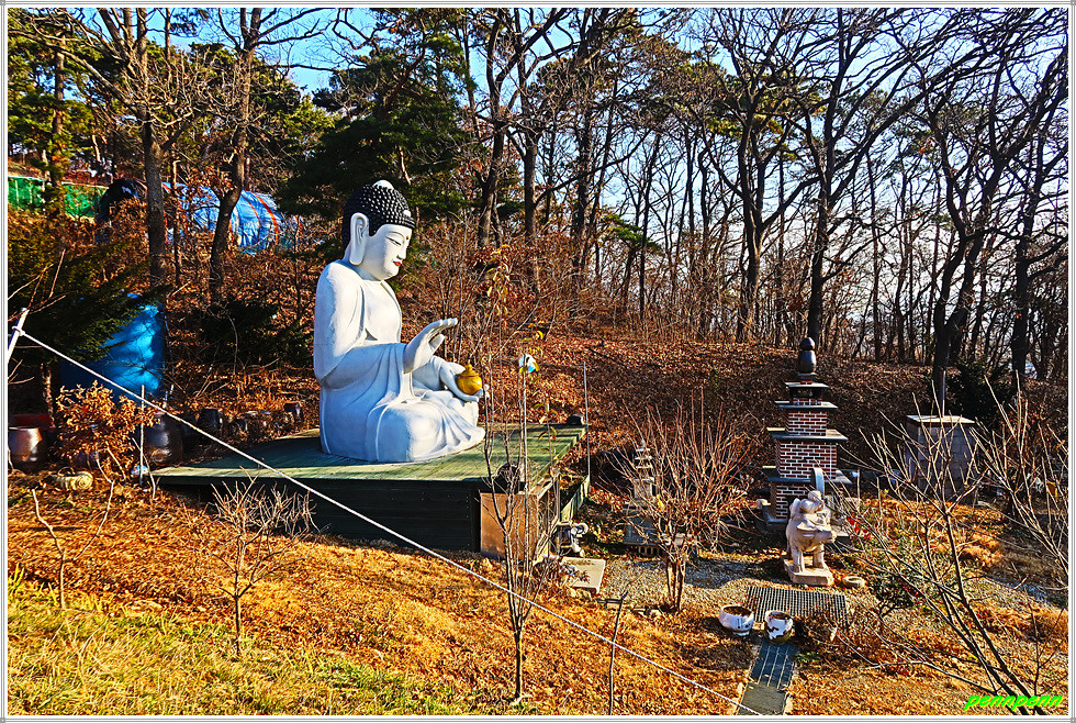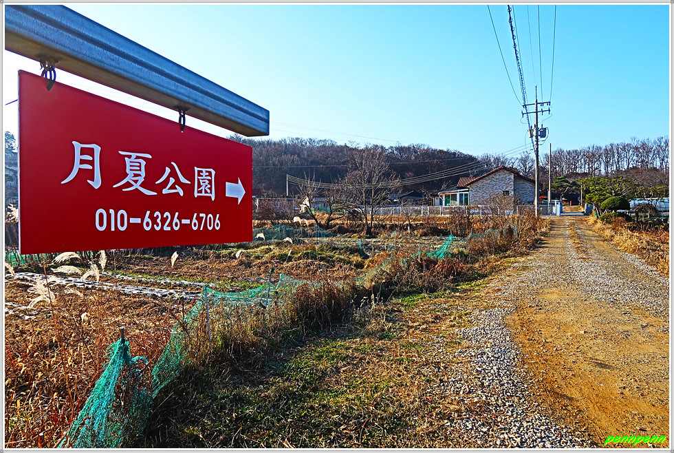 선원사 입구에서 도로를 건너 직진하면 선원사연꽃축제장을 알리는 대형표석이 세워져 있는데 실제로 약 15년 전 이곳을 방문해 화려한 연꽃을 보며 감탄한 적이 있었지만 당시 연꽃단지는 지금은 전부 다른 용도로 변경된 듯합니다. 남산대마을 표석을 지나 월하공원방향으로 진입합니다. 월하공원은 석탑과 불상 등이 보이는 사유지 같은 공원이네요. 이곳에는 6코스의 그림안내지도가 세워져 있습니다.
