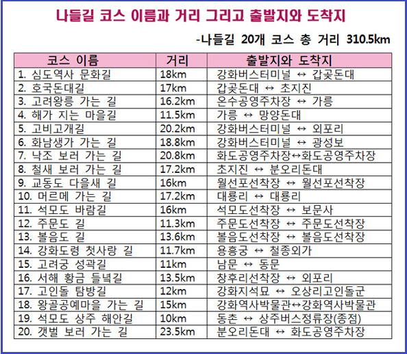 인천시 강화군은 9개의 유인도와 17개의 무인도로 이루어진 수도권 제1의 청정지역입니다. 강화나들길은 강화도 14개코스(174.9km), 교동도 2개코스(33.3km), 석모도 2개코스(26km), 주문도 1개코스(11.3km) 및 볼음도 1개코스(13.6km) 등 모두 20개코스 310.5km에 달하는 도보길입니다.