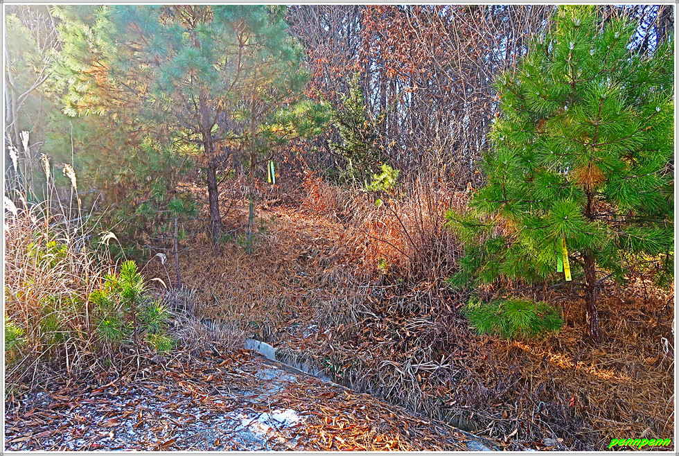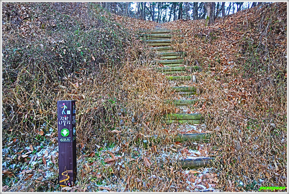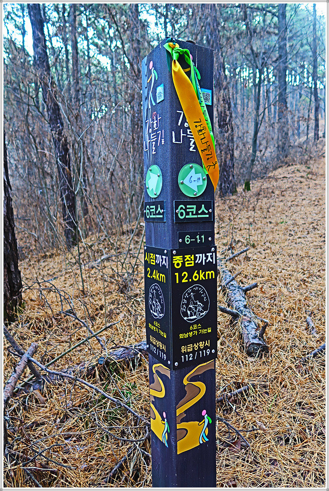 창리감리교회와 송림빌라를 지나 좌측에 있는 강화정신요양원 쪽으로 진입하면 이제부터는 이정표와 리본이 잘 걸려 있어 길을 찾기는 어렵지 않습니다. 요양원 갈림길에서 6코스는 요양원 반대방향인 우측으로 이어집니다. 현재 영업을 하지 않는 강화스파랜드를 돌아 숲으로 진입합니다. 통나무계단을 올라 소나무 숲길을 걷습니다. 그런데 공식 이정표를 보니 시점에서 2.4km를 지나왔으며 목적지까지 남은 거리는 12.6km라고 표기되어 있어 전체거리는 15km입니다. 강화나들길 홈페이지에는 6코스 거리가 18.8km인데 15km라니 거리가 단축되어 안도합니다.