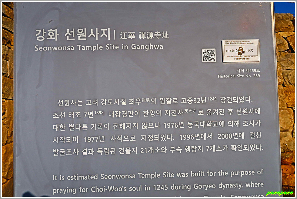 강화군 선원면 지산리 소재 선원사지(사적 제259호)는 고려시대 대몽항쟁 당시 고려대장경 목판을 조각하던 곳으로 추정되는 사찰터입니다. 선원사는 고려시대에 몽골의 침략을 받아 강화도로 도읍을 옮긴 후 1245년(고려 고종 32) 당시 최고 권력자였던 최우(崔瑀)가 대몽항쟁의 정신적 지주로 삼고자 창건한 곳으로 대장도감(大藏都監)을 설치하여 팔만대장경을 조각했으며 팔만대장경 목판은 현재 합천 해인사에 봉안되어 있습니다. 다만 이곳이 조선왕조실록에서 전하는 고려 팔만대장경을 판각했던 선원사(禪源寺)터로 볼 수 있는 고고학적 자료가 확인되지 않아 이에 대하여는 장기적인 조사연구가 필요하다는군요.(자료/다음백과사전에서 발췌인용).