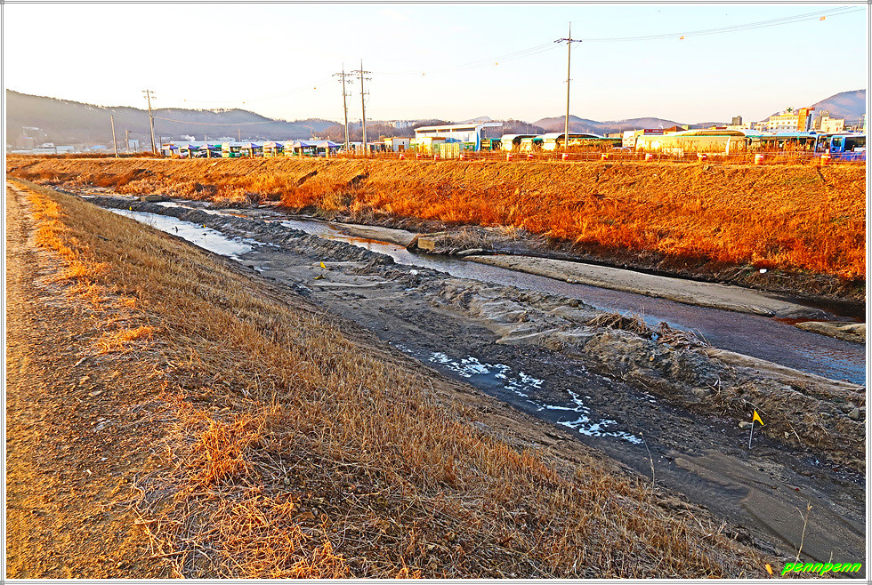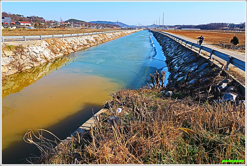 여기서 실개천(동락천) 둑을 걸어갑니다. 강화나들길 공식 홈페이지에 의하면 둑을 따라 가다가 징검다리를 건너 우측으로 가야하지만 현재 건널 수 있는 징검다리가 보이지 않아 수문을 지나 계속 진행합니다. 한참을 가다가 동락천에 걸린 이름 없는 다리를 건너 직진해 차도를 만나 우측으로 갑니다. 창1리마을회관을 지난 후 6코스 공식 이정표를 만나 안도했습니다.