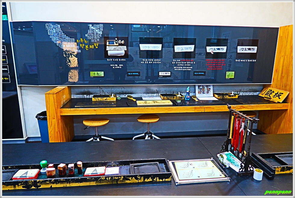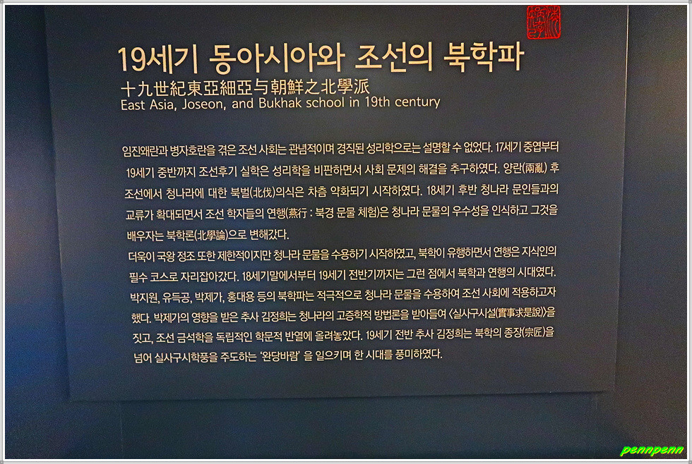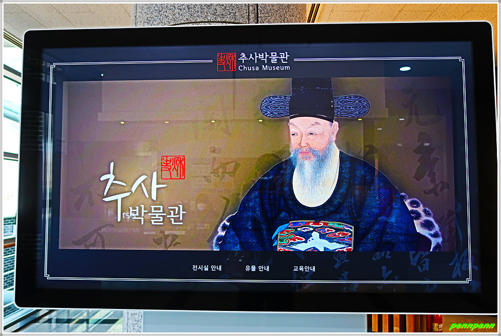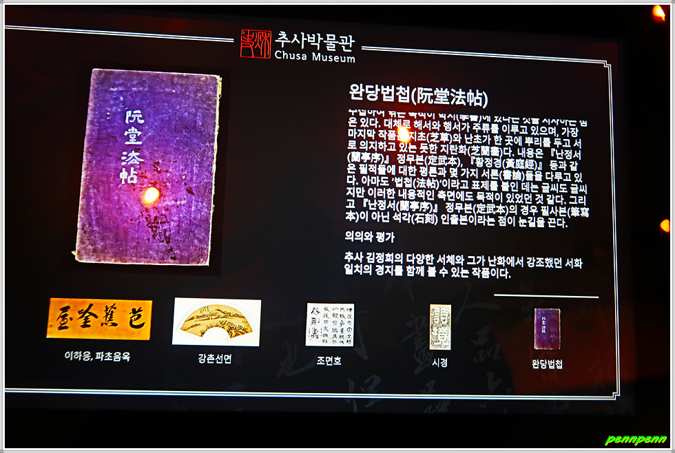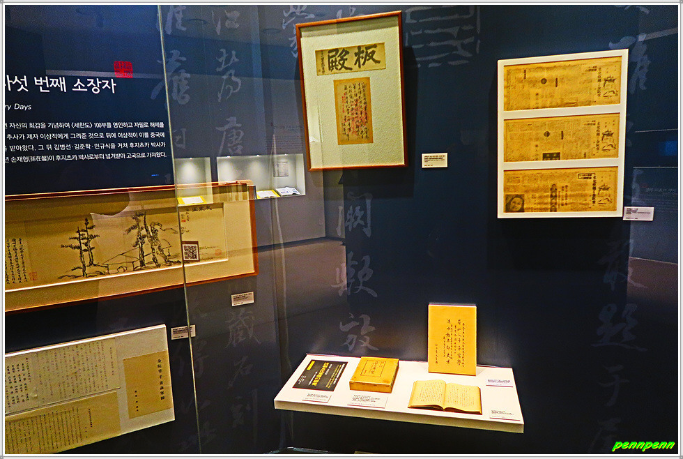 1층 “추사의 학예실”은 추사의 학문과 예술을 주제별로 보여주는 공간입니다. 북학파의 영향으로 추사가 청나라의 새로운 문물에 눈을 뜨는 과정, 청나라학자들과의 활발한 교류, 조선금석학의 연구와 여러 계층과의 교유, 추사의 글씨에 관한 연구 등을 확인할 수 있습니다. 특히 추사가 벼루 10개, 붓 1천 자루를 사용했다는 대목은 정말 놀라울 지경입니다.