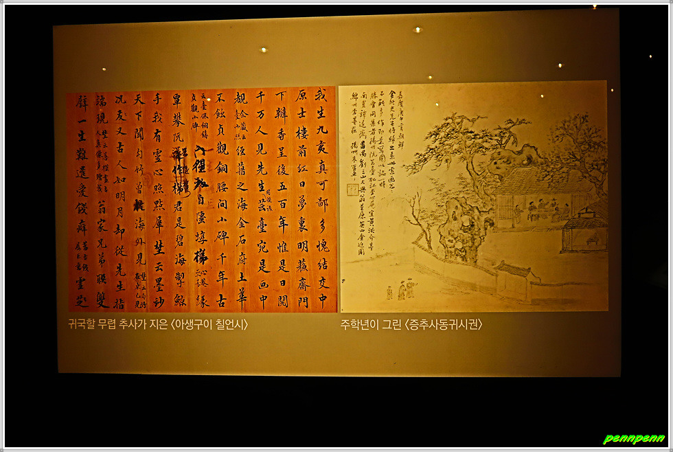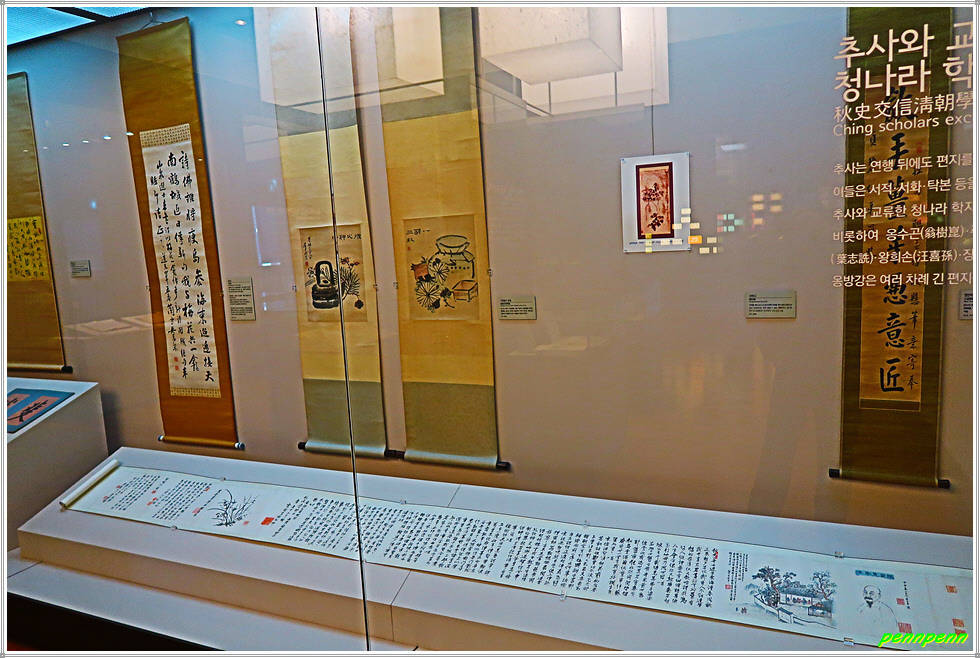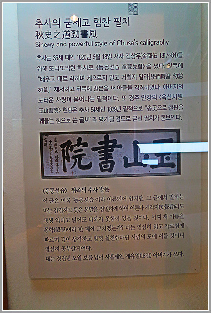 관람은 박물관 2층 “추사의 생애실”부터 시작합니다. 김정희의 호는 추사, 완당, 예당, 노과 등이며, 1809년 연경에 가는 부사 김노경(추사의 부)을 따라 그곳에서 40일간 머물며 청나라 고증학을 접했습니다. 1819년 문과에 급제해 규장각 대교, 병조참판, 성균관 대사성 등을 지냈으며, 1840년부터 9년간 제주도에 유배된 후 1851년부터 1년간 함경북도 북청에 유배되었습니다. 유배에서 돌아온 추사는 과천 과지초당에서 4년간 머물다 별세했습니다.