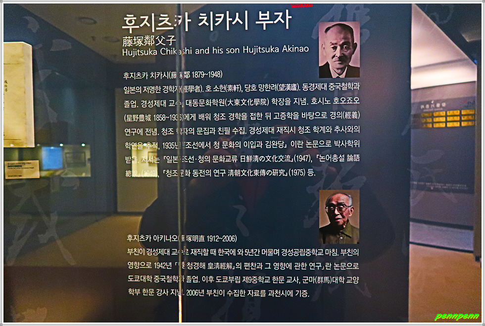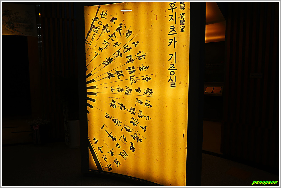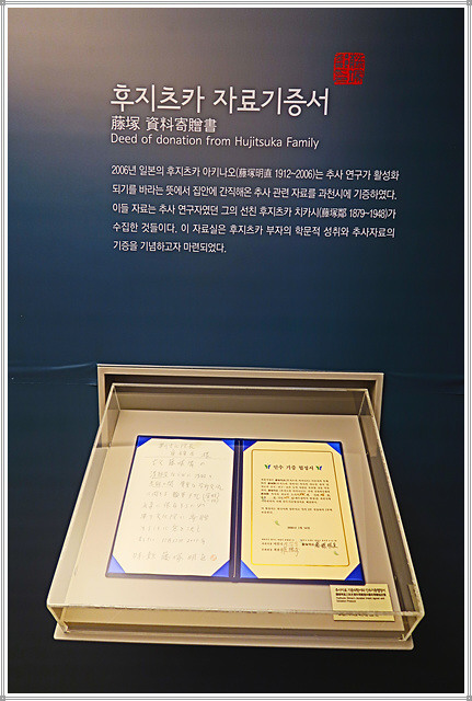 지하1층은 “후지츠카 기증실”입니다. 이는 추사 연구의 대가였던 일본인 후지츠카 지카기 교수가 평생 수집해 기증한 추사 관련 자료 전시실입니다. 그는 경성제국대학 중국철학 교수로 추사관련 청 및 조선의 자료를 수집하고 연구했습니다. 그의 아들 아키나오는 선친에게 물려받은 자료의 기증을 원하는 동경대학 도서관의 요청을 뿌리치고, 2006년에서 과천 추사박물관에 총 1만 5,000여 점을 기증했습니다.