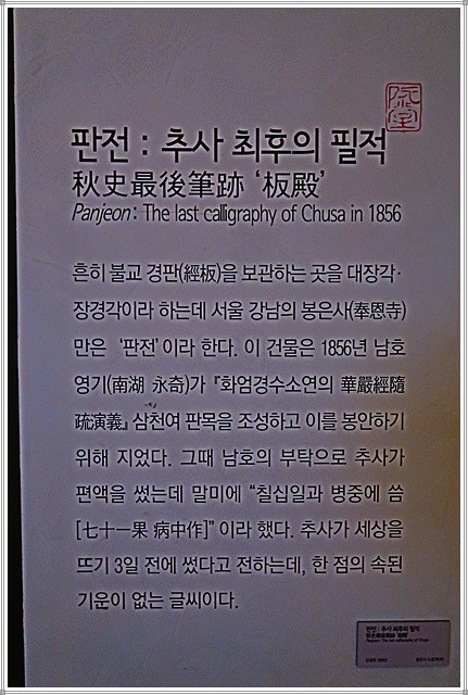 이번에는 추사최후의 필적을 살펴보겠습니다. 북청유배에서 돌아온 추사는 부친이 세운 과지초당에 머물며 여생을 보냈는데, 강남의 봉은사에 남아있는 판전(版殿)은 추사가 죽기 3일전 쓴 마지막 글씨입니다. 불교현판을 보관하는 곳을 대장각 또는 장경각이러고 하는데 봉은사의 경우 판전이라고 부릅니다. 위에 소개한 것 이외 추사와 관련된 자료를 일괄적으로 게재합니다.