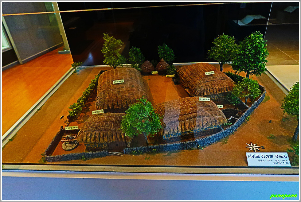 추사는 55세이던 1840년 정치적인 사건으로 모함을 받아 제주 서귀포 대정현에 유배되었는데, 9년간의 고단한 귀양살이 속에서도 자신만의 독특한 글씨체인 추사체를 이루며 학문과 예술의 대한 열정을 불태웠으며, 그의 대표작인 세한도 및 일로향실 등이 유배시설의 작품입니다.