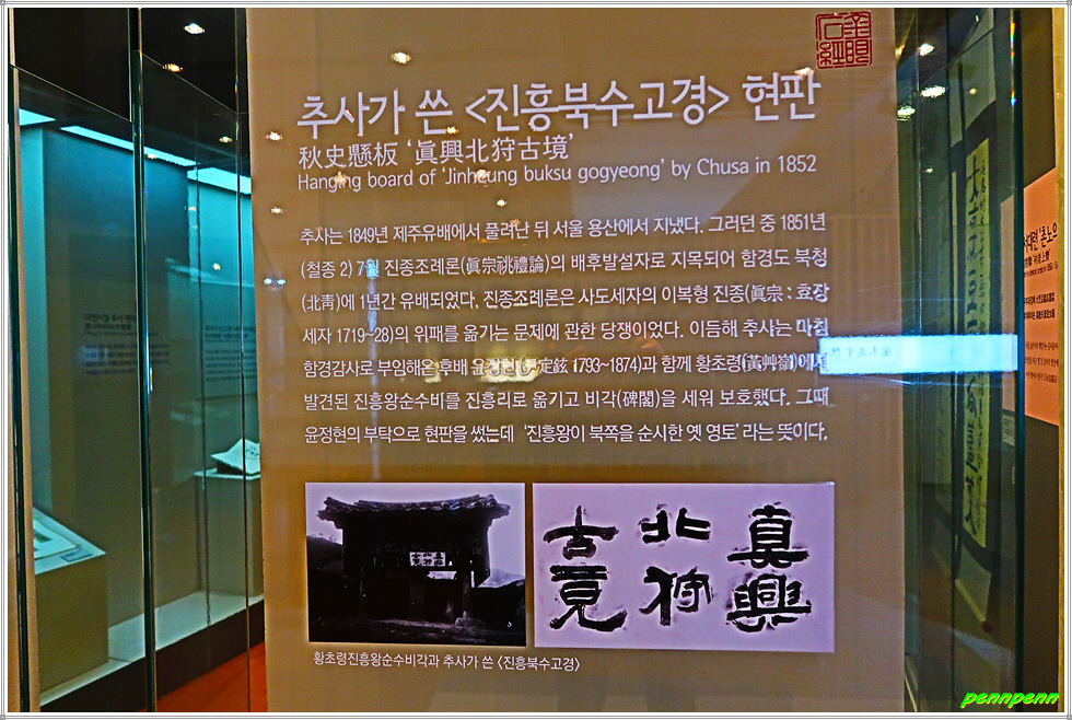 제주 유배에서 풀려난 추사는 또 다시 모함을 받아 함경도 북청으로 유배를 갔습니다. 이 때 친한 후배 윤정현이 함경감사로 오게 되자 추사는 윤정현과 함께 황초령에서 발견된 진흥왕 순수비를 원래의 자리인 진흥리로 옮기고 비석보호각을 세웠습니다. 이때 함경감사의 부탁으로 진흥북수고경(振興北狩古竟)이라는 현판을 썼습니다. 이는 “진흥왕이 북쪽을 순시한 옛 영토”라는 뜻이랍니다.