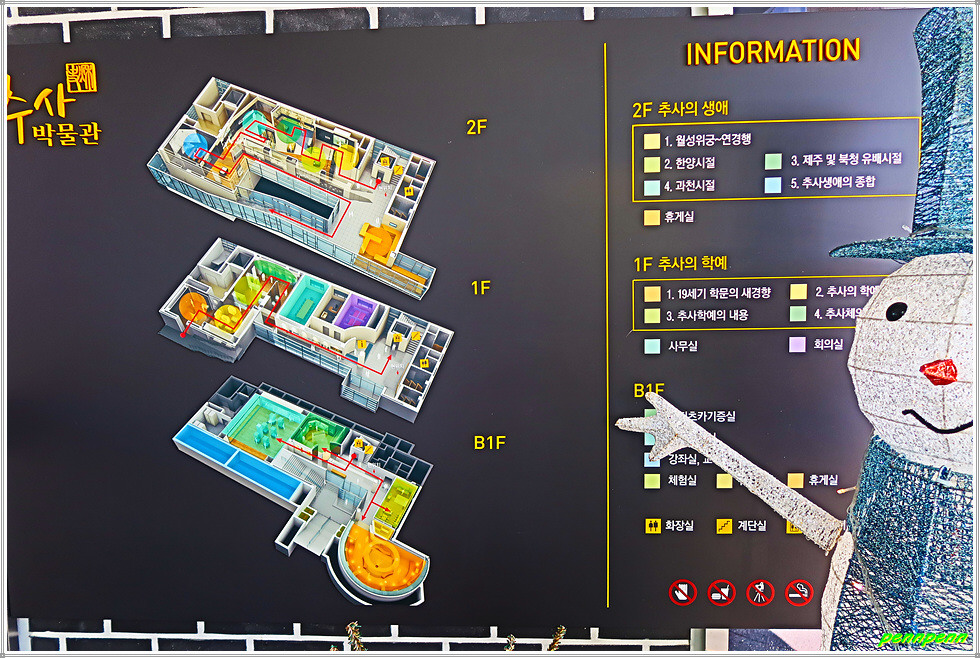 박물관 야외에는 과지초당이 있으며, 박물관은 지상 2층, 지하 1층으로 구성되어 있는데, 1층은 추사의 학예 전시실, 2층은 추사의 생애에 관련자료 전시실, 1하 1층은 후지츠카 기증실과 기획전시실입니다.