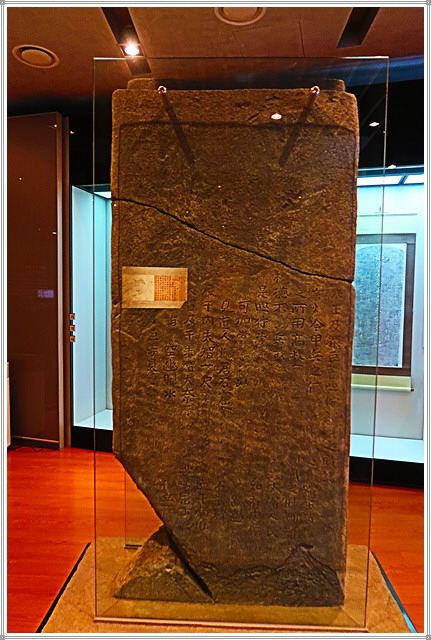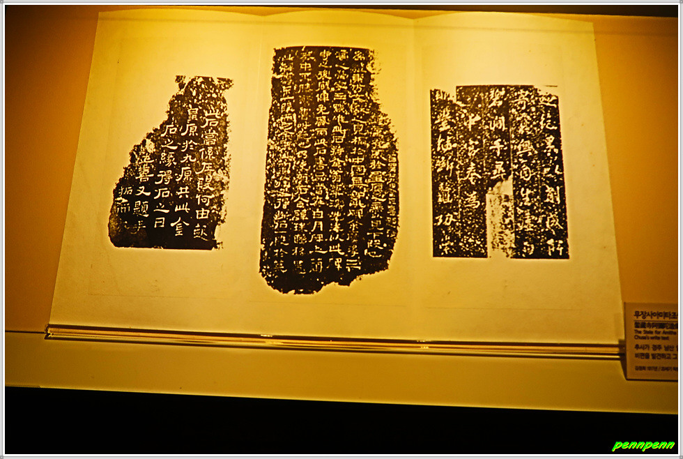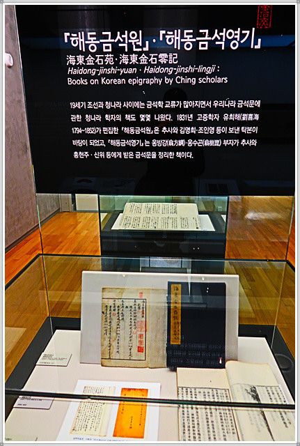 이곳에는 진흥왕 순수비 모형이 전시되어 있는데요. 금석학(쇠붙이나 돌에 새겨진 그림과 글씨를 연구하는 학문)을 배운 김정희의 업적 중 가장 잘 알려진 것이 바로 북한산의 진흥왕 순수비를 밝혀낸 것입니다. 그간 이 비석은 조선의 건국에 큰 공을 세운 무학대사가 만든 비석으로 알려져 있었는데, 1400년 전에 한강 하류가 신라의 영토임을 알리는 순수비였음을 알아낸 것이 추사 김정희였습니다. 1816년 순수비의 발견은 우리의 고대사를 제대로 파악할 수 있게 해주었다는 점에서 역사 속에서 아주 큰 의미를 가지고 있습니다.