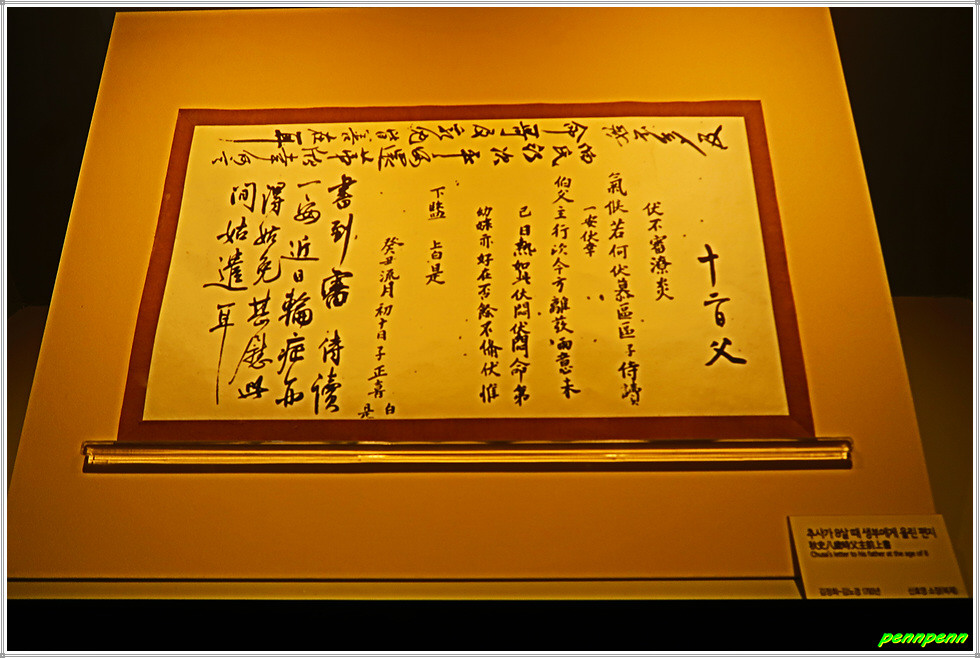 추사는 불과 8세 때 아들이 없는 큰 아버지(김노영)의 양자가 되었는데 이때 친아버지에게 보낸 편지(아버지를 기리는 마음과 동생들의 안부, 그리고 학문에 매진한다는 소식을 전함)가 지금도 남아 있어 그의 효심과 형제간 우애를 엿볼 수 있습니다.