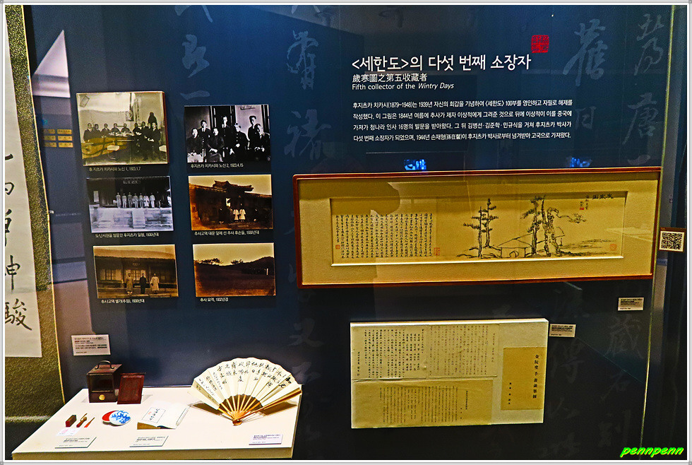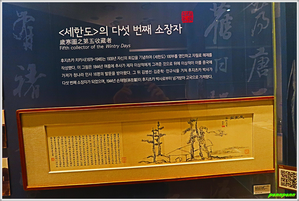 그림 끝에 작화 경위를 담은 추사의 발문이 있고 후일 이상적이 이 그림을 중국에 가져가 청대 16명사들의 찬시를 받아 왔으며, 뒷날 이 그림을 본 김정희의 문하생 김석준의 찬문과 오세창·이시영의 배관기 등이 함께 붙어 긴 두루마리를 이루고 있습니다. 그 뒤 세한도는 김병선, 김준학, 민규식을 거쳐 후지츠카 박사가 다섯 번 째 소장자가 되었으며, 1944년 손재형이 후지츠카로부터 넘겨받아 고국으로 가져온 것입니다.