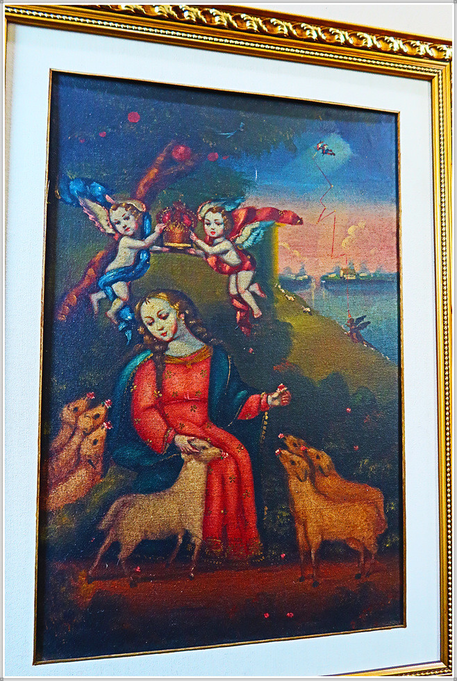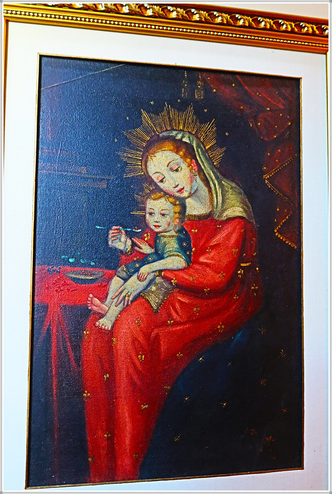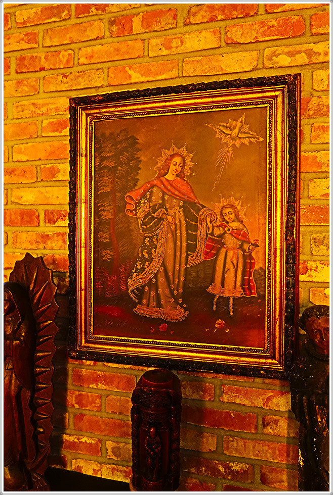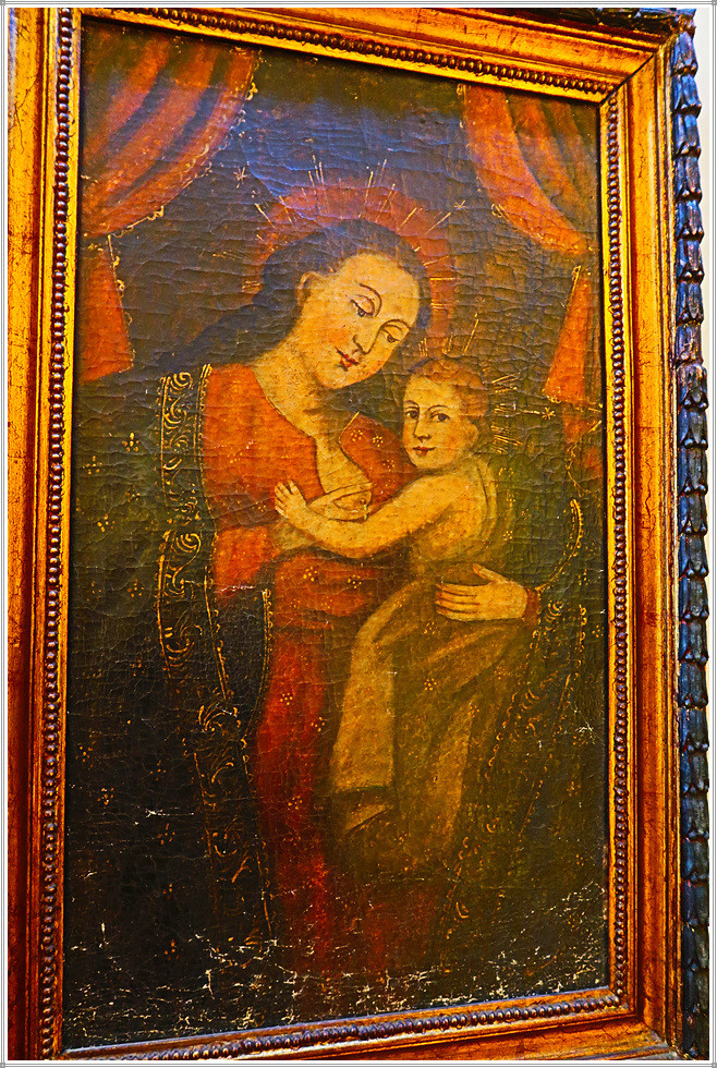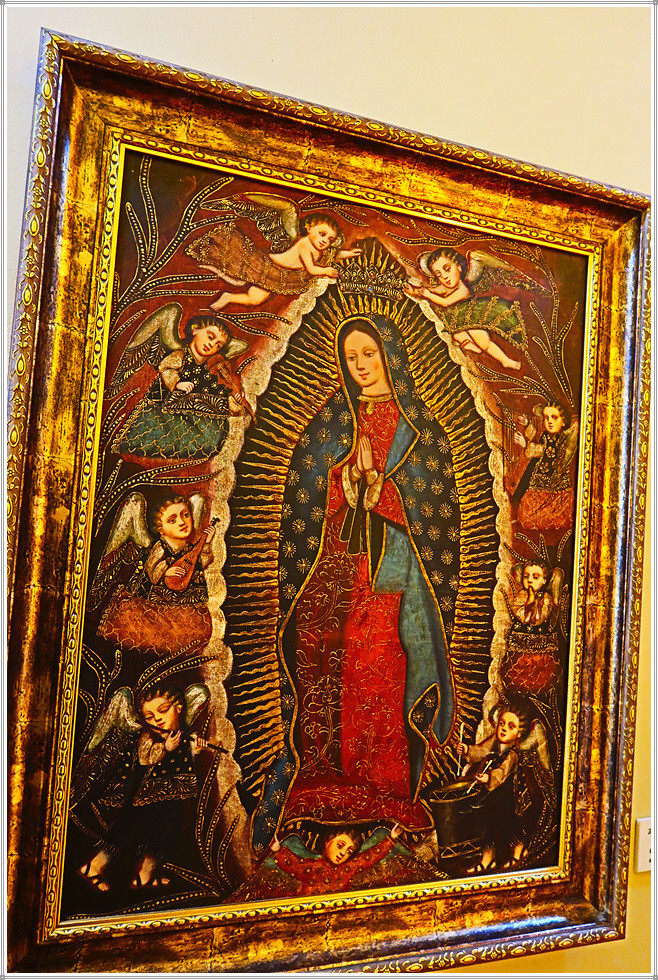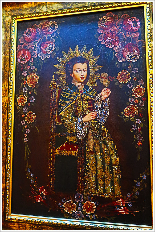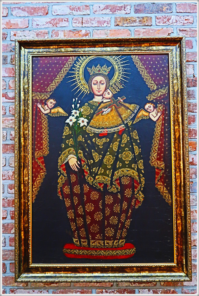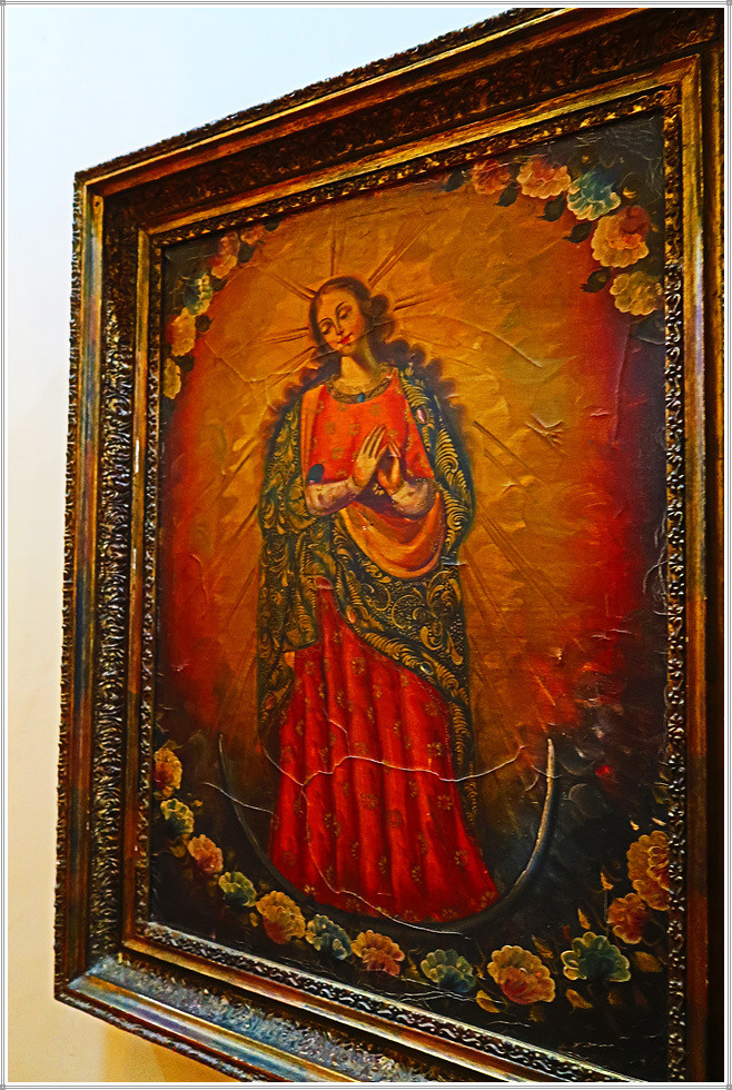 성당 좌우 회랑에는 각종 성화와 성물이 진열되어 있는데 그 중에서도 꾸스코 유파의 그림이 독특합니다. 꾸스코 유파의 종교화는 16세기~18세기 스페인 식민기 페루의 꾸스코(잉카제국의 수도) 지역에서 활동한 가톨릭 종교화풍의 작가와 작품을 일컫는 말입니다. 1534년 잉카제국을 정복한 스페인은 가톨릭 전파를 위해 종교적인 예술가 그룹을 꾸스코에 보냈으며 이들은 케추아족과 혼혈인들을 위한 학교를 세우고 드로잉과 유화를 가르쳤습니다. 꾸스코 미술은 종교적(가톨릭) 주제의 사용, 원근법의 부족, 빨강, 황색, 흙색과 금박을 사용한 것이 특징으로 특히 성모 마리아의 성상에 화려한 금박이 많이 사용했습니다. 꾸스코 유파의 작품은 학교에서 제작하기 때문에 개별 작가의 이름이 남아 있지 않으며, 작품의 대다수는 현재 꾸스코 지역에 보존되어있고, 에콰도르와 볼리비아 등 안데스지역에도 남아 있습니다.