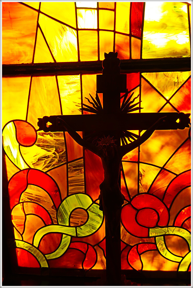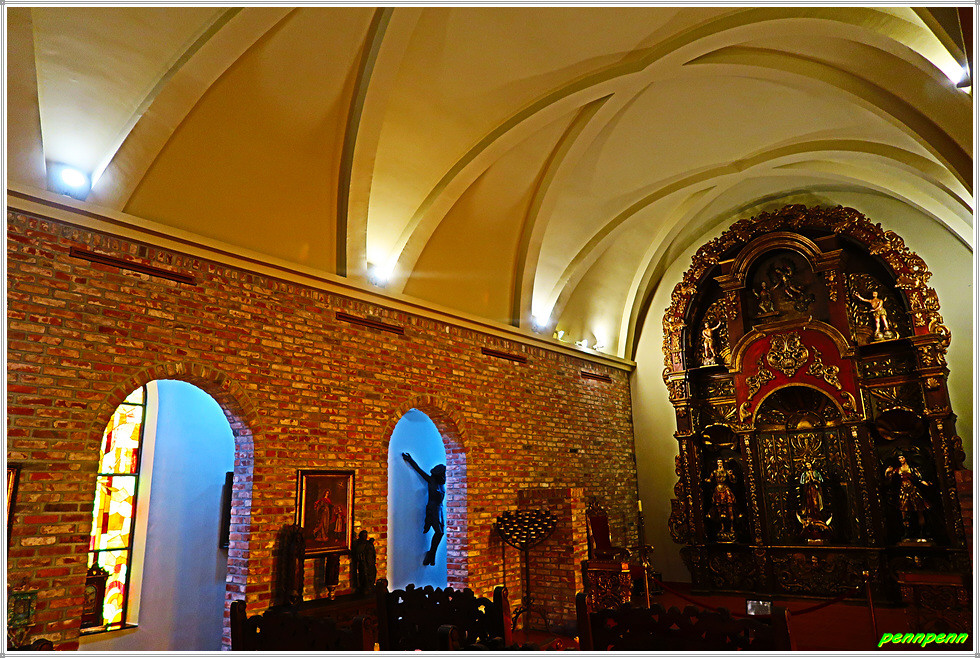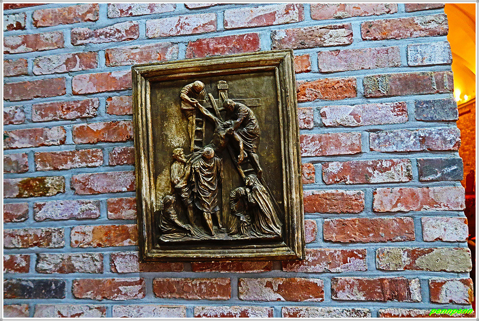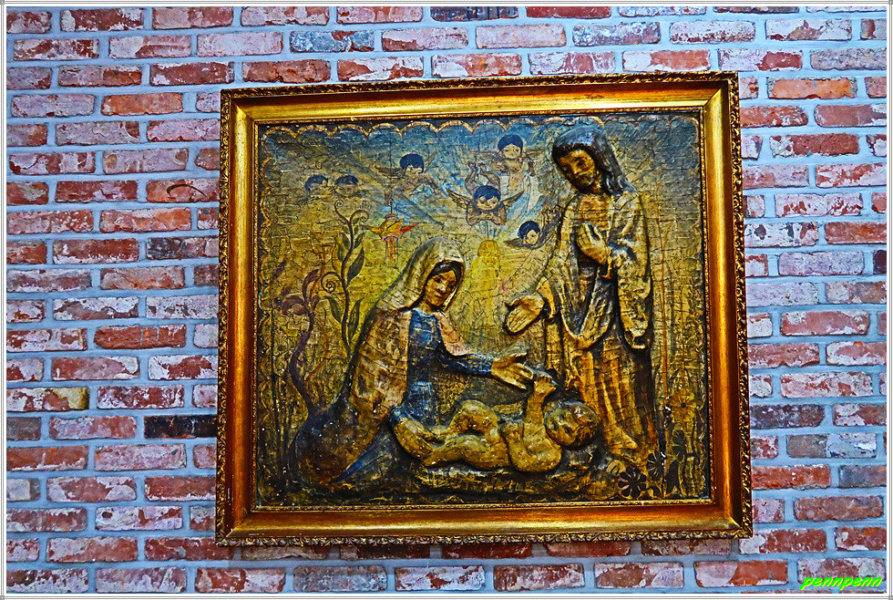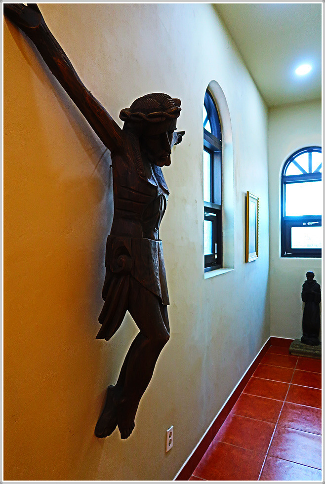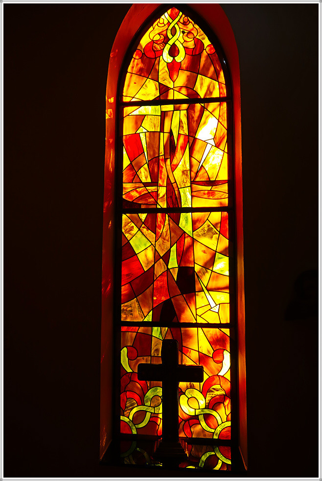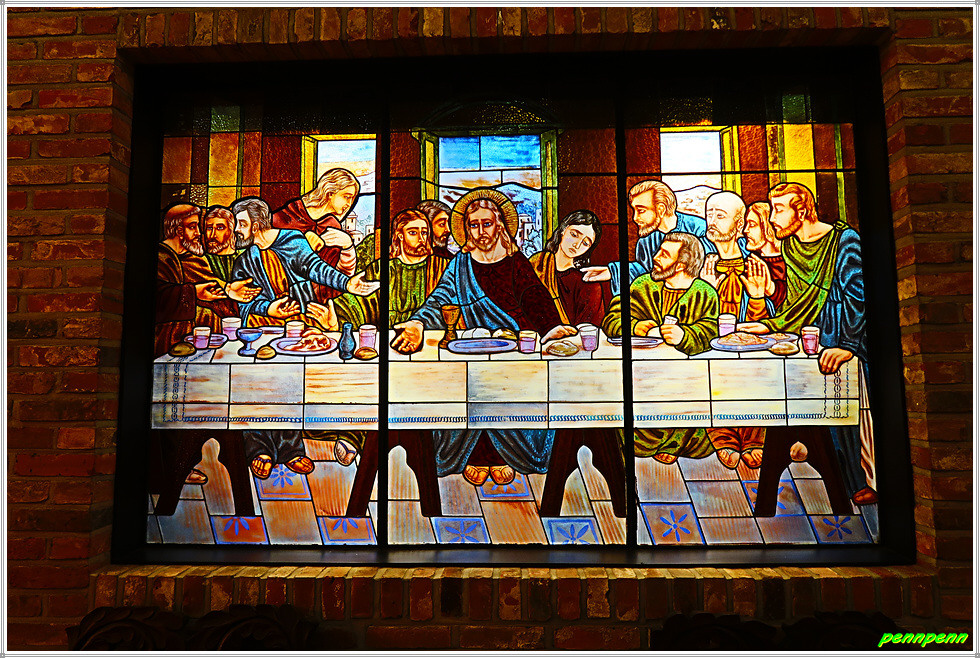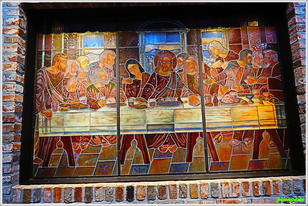 안쪽 벽면에는 최후의 만찬 그림이 있는데 조명이 어두워 희미하게 보일 뿐입니다. 그렇지만 성당의 예배실로 들어가면 최후의 만찬에 등장하는 인물들이 또렷하게 식별됩니다. 이 그림은 멕시코 산 앙헬 공방(Mexico, San Angel)이 스테인드 글라스(230x150cm)를 이용해 제작한 것입니다.