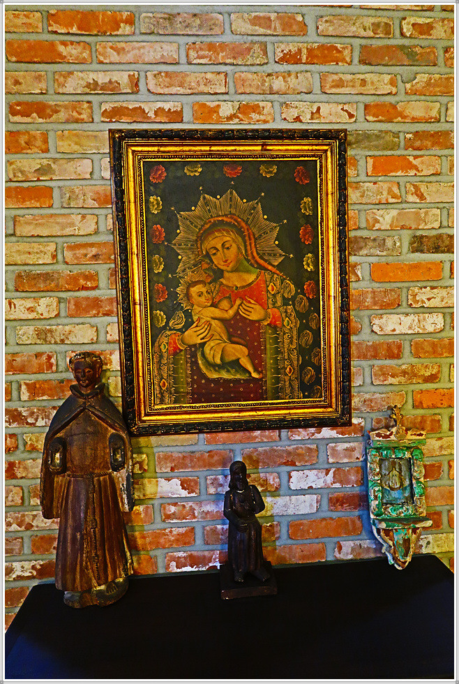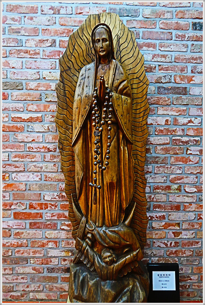 종교전시관은 중남미의 초기 예배당답게 그 규모는 상당히 아담합니다. 우리나라에서 볼 수 있는 작은 성당을 연상케 하는군요. 안으로 들어서면 과달루페 성모상이 보입니다. 과달루페의 성모(Santa Maria de Guadalupe, 목조각 80x230cm)는 16세기 멕시코에서 발현했다고 전해지며, 멕시코의 종교와 문화를 대표하는 이미지로 멕시코인들의 어머니로 불립니다. 성모 축일 날짜는 12월 12일인데, 이는 성모 마리아가 멕시코시티 인근 원주민의 태양의 여신 성지였던 테페약 언덕에서 성 후안 디에고에게 발현한 날짜인 1531년 12월 12일을 기념하여 제정한 것입니다.