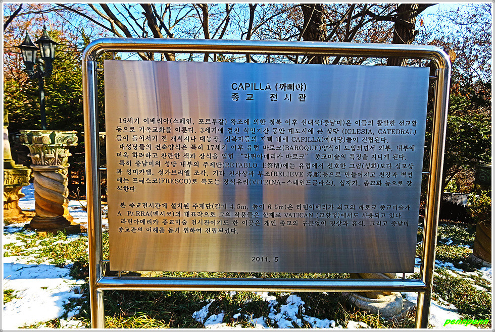 중남미문화원 종교전시관(까삐야, Capilla)은 야외조각공원 맨 우측에 자리 잡고 있습니다. 이 전시관은 라틴 아메리카 종교미술전시관을 겸하고 있는데, 이는 종교의 구분 없이 중남미종교의 이해를 돕기 위해 건립된 것입니다.