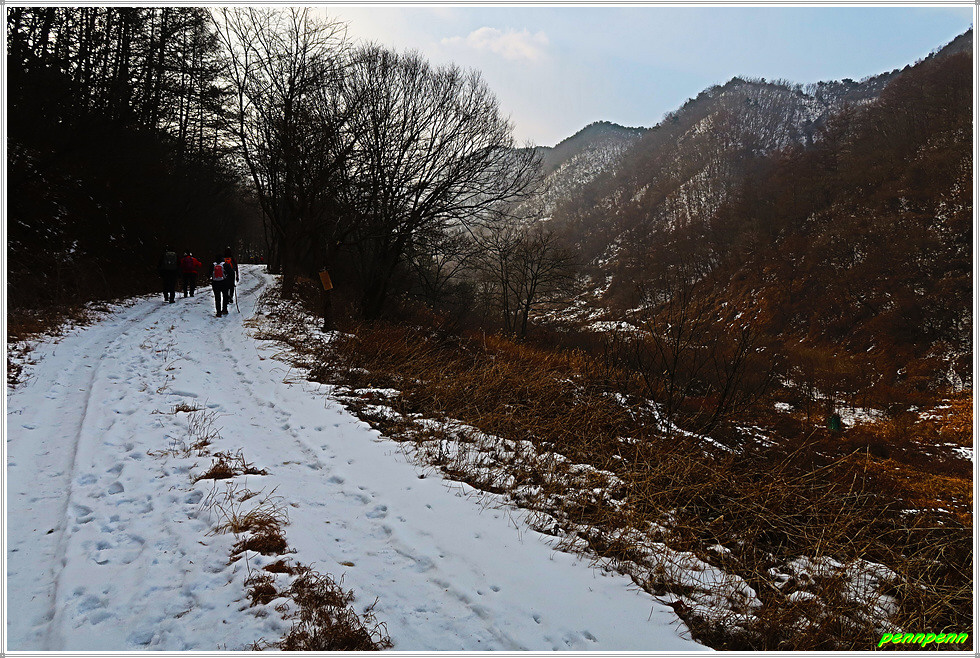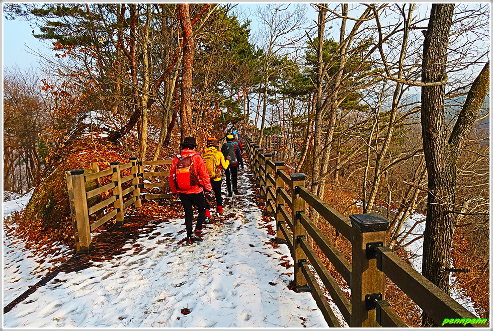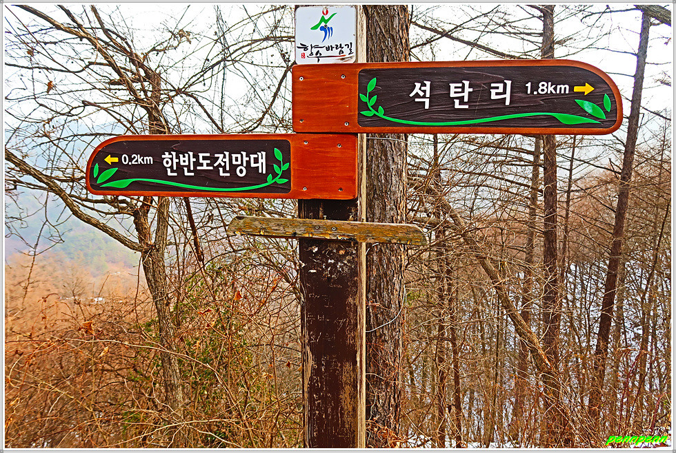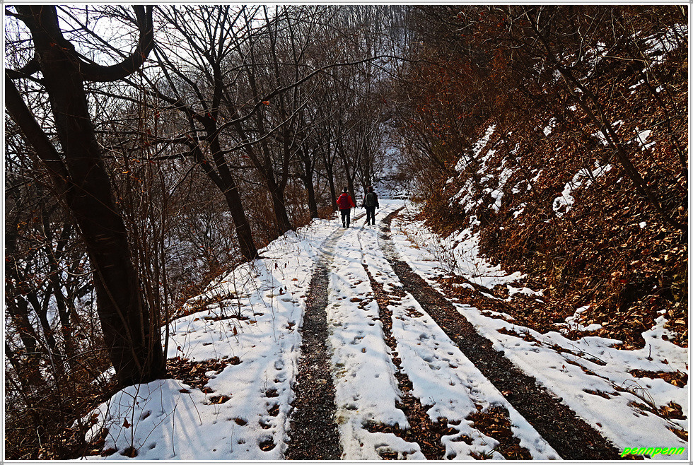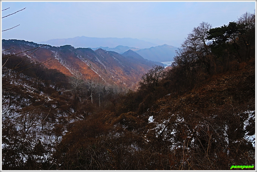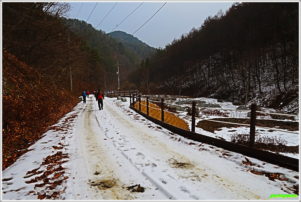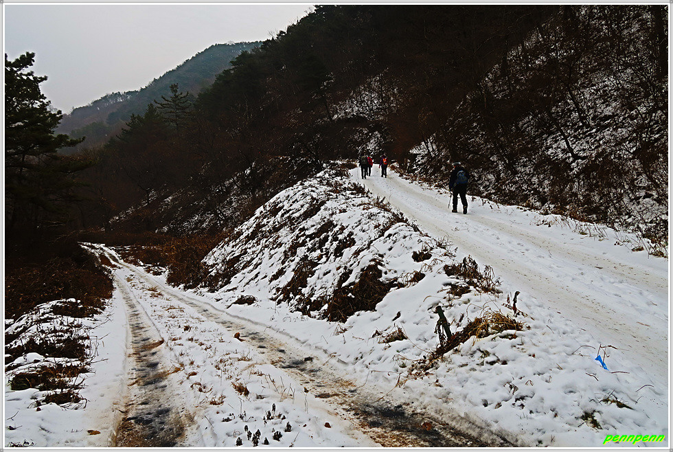 골짜기여서 응달인 임도에는 눈이 많이 쌓여 있어 길이 제법 미끄럽습니다. 임도는 점점 고도를 높이다가 약간 내리막 지점에 있는 한반도 전망대에 올랐는데, 보이는 것이라고는 금강변에 펼쳐진 산과 강만 보일뿐 한반도지형의 모습은 찾을 수가 없어 실망입니다.