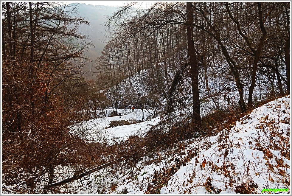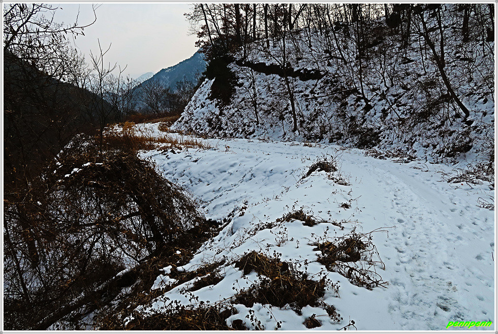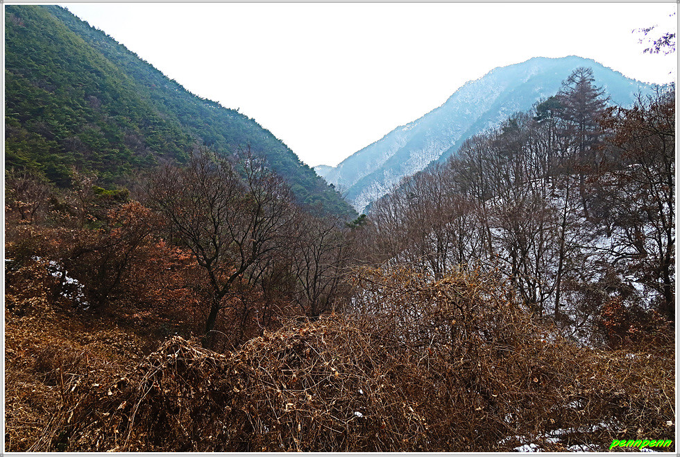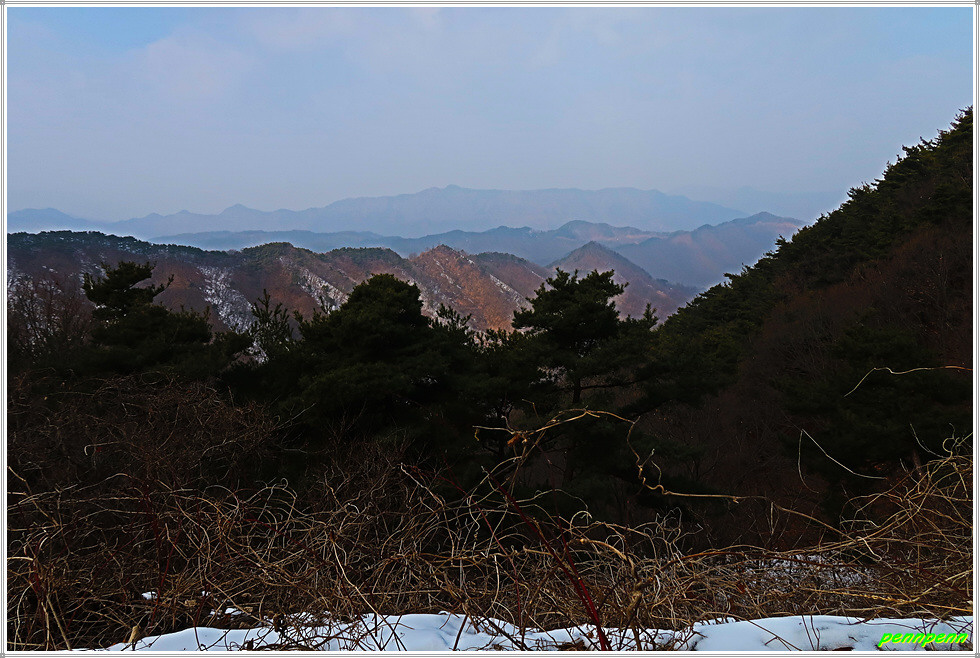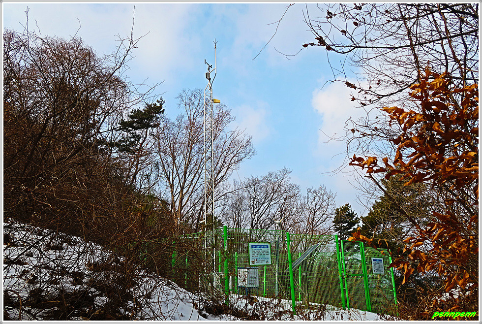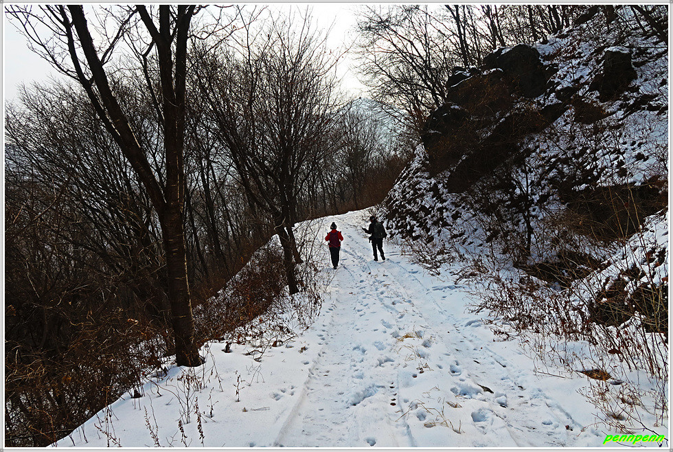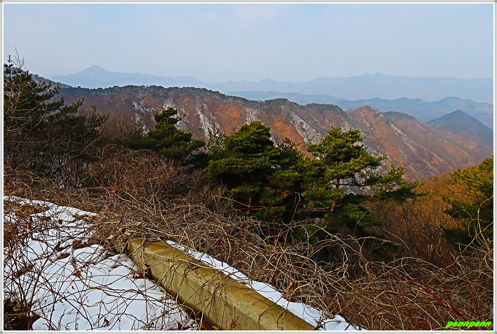골짜기여서 응달인 임도에는 눈이 많이 쌓여 있어 길이 제법 미끄럽습니다. 임도는 점점 고도를 높이다가 약간 내리막 지점에 있는 한반도 전망대에 올랐는데, 보이는 것이라고는 금강변에 펼쳐진 산과 강만 보일뿐 한반도지형의 모습은 찾을 수가 없어 실망입니다.