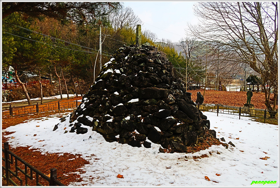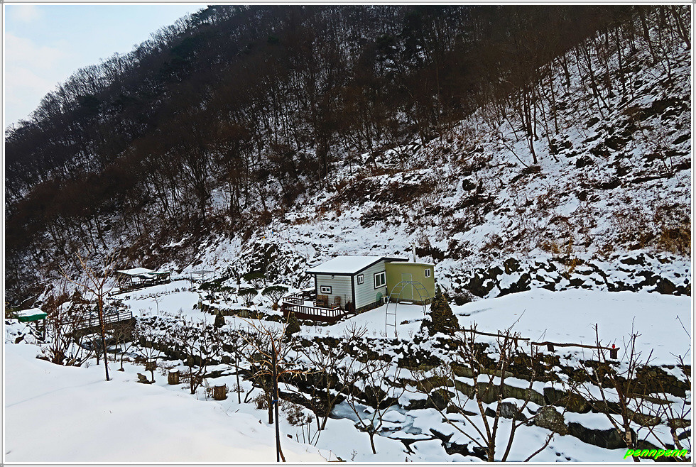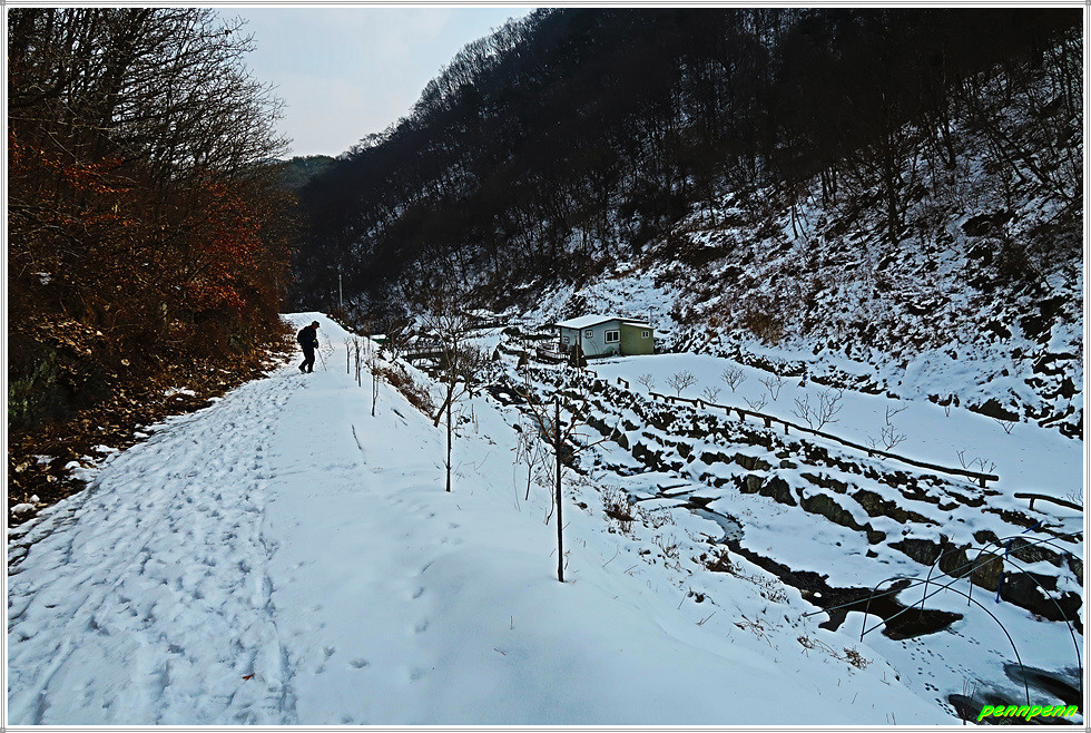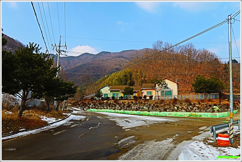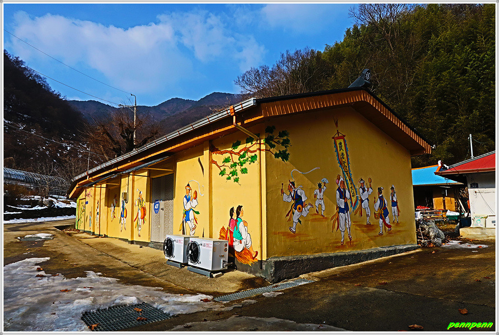이제부터는 내려가는 일만 남았습니다. 말티고개 삼거리(석탄리와 청마리를 잇는 삼거리)를 지나 상당히 깊은 골짜기를 지나가는데 눈이 더욱 많이 쌓여있네요. 골짜기를 벗어나면 목적지인 청마리마을입니다. 청마리마을을 알리는 대형표석과 이정표가 세워져 있군요. 이웃한 건물에는 농악을 소재로 한 벽화가 그려져 있어 눈길을 끕니다.
